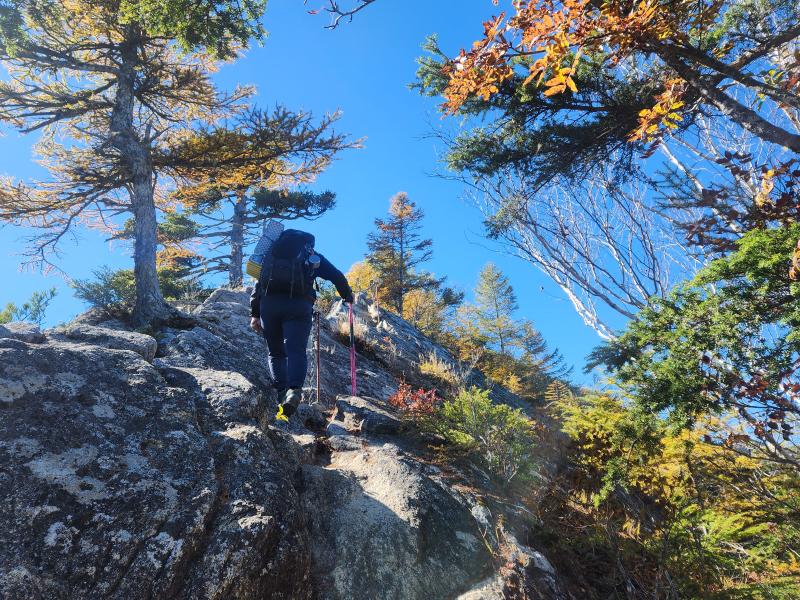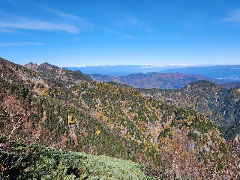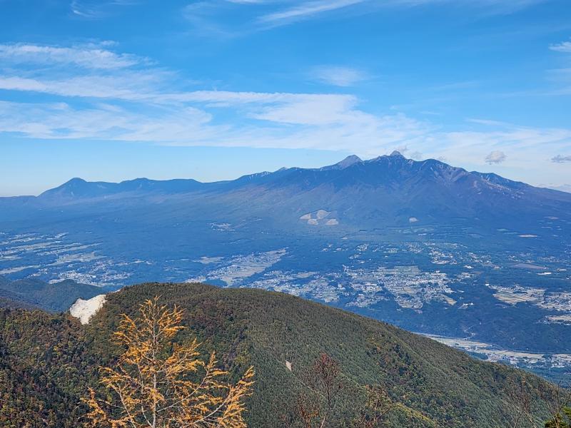 前半の樹林帯ではブナやダケカンバ、標高が上がるとカラマツも交じり全体的に黄色が目立つ印象でした。中腹の刃渡りでは展望が開けて、両翼を広げた八ヶ岳をはじめ、富士山や北アルプスなど、見覚えのある山が次々に現れ見応え抜群。珍しくお天気に恵まれました。