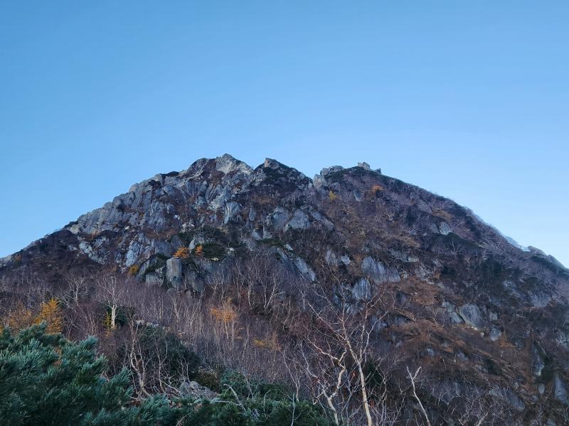 暑すぎて敗退した真夏の黒戸尾根、微かに冬の気配が漂う晩秋にリベンジしてきました。水や食料は少なめとはいえ、防寒着や厚めの寝袋など冬一歩手前の装備を詰め込んだザックはパンパン、久々のテン泊装備での7時間行動は少々不安でした。少しでも早く出発するために甲府で前泊しましたが、見事に寝坊し1時間の遅刻をして朝7時過ぎに登り始めました。バタバタのスタートでしたが穏やかな天気の中、ゆっくりペースで登りバテることなく14時過ぎには七丈小屋に到着できました。