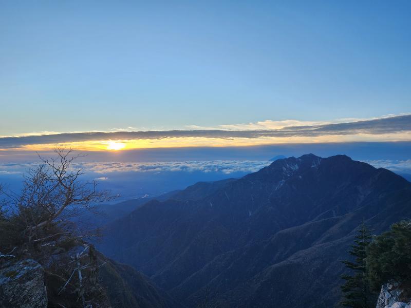 鳳凰三山を眺められる位置にテントを張り、夜に備えて早速ダウンを着込みました。雪がまだ降ってなかったとはいえ、じっとしていると凍える寒さです。コンパクトなテン場でしたがこの日は私たちの他に3張。小屋にもそれなりの人数が泊まっているようでした。