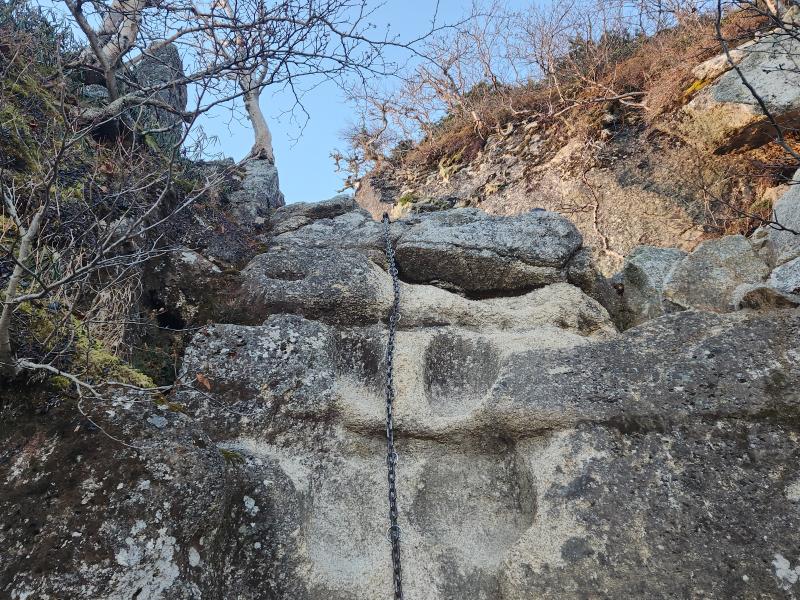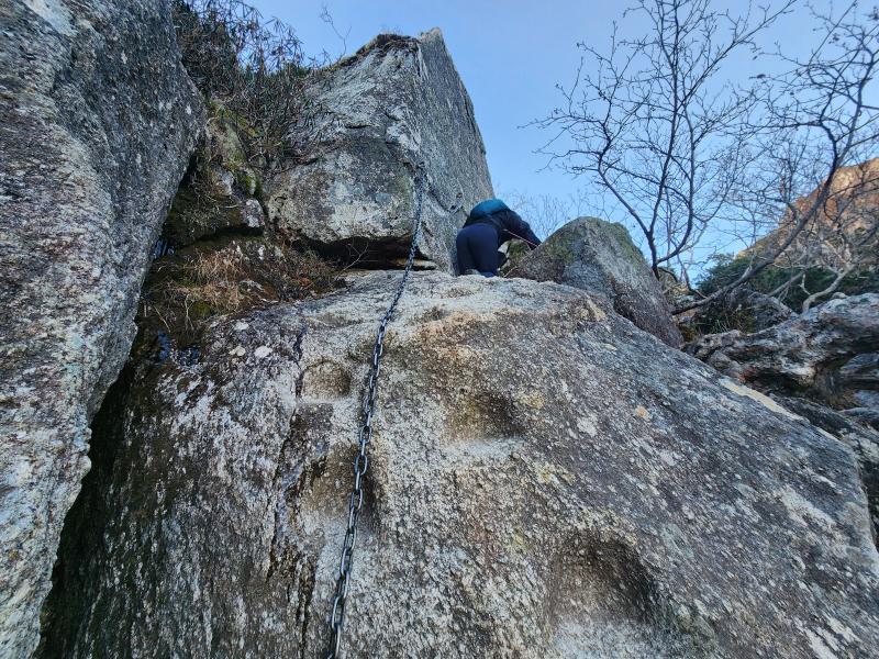- ○鎖場はステップや手がかり豊富で登りやすくなっています。狭いのでザックの外付けは避けたいところです。
