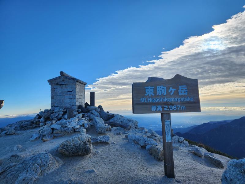 【2日目】テント場(40分)八合目御来迎場(50分)ニ本剣(40分)甲斐駒ヶ岳(30分)二本剣(30分)八合目(20分)テント場(10分)七丈小屋(40分)五合目(40分)刃渡り(90分)一合目(50分)登山口