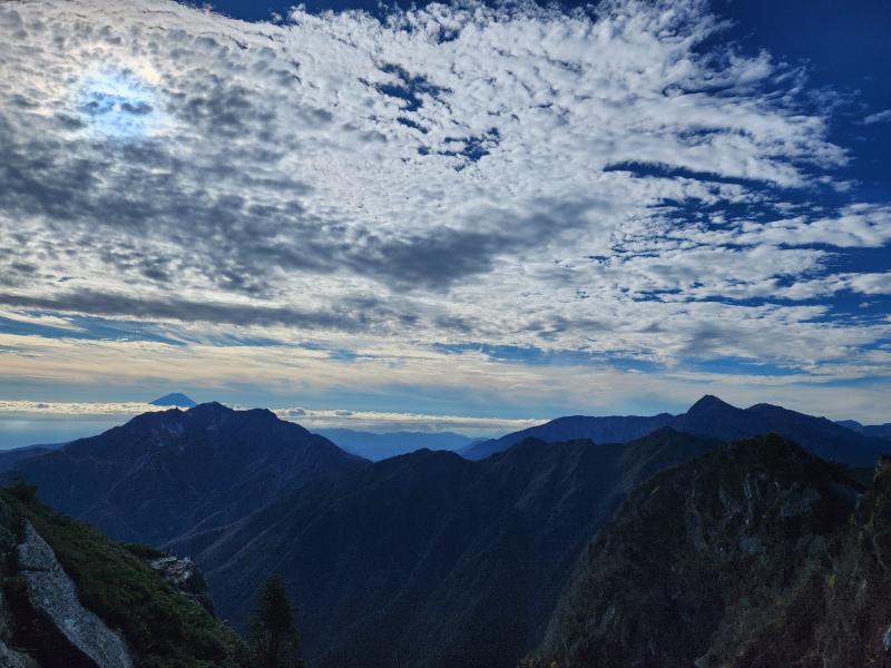翌朝は日の出前にヘッデンを点けて登り出しました。標高が上がるに連れ、白い花崗岩帯となり甲斐駒ヶ岳らしい風景が広がります。古の修験者が刺したものなのか、黒戸尾根名物の二本の剣も富士山と一緒に拝むことが出来ました。ここまで来るとさらに目立ってくるのが日本第二の高峰・北岳です。見る位置によって表情の変わる山ですが、鎌をもたげたような鋭いピークには目を見張るものがあり非常に印象的でした。頂上から北側には茶色く尖った鋸岳が。静かで不気味な雰囲気の未踏峰です。元気なうちに挑戦してみたいものです。