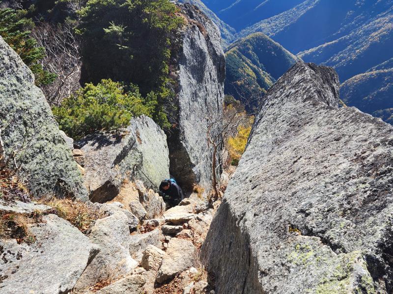 昨日よりさらに進んだ紅葉を眺めながら、最後まで穏やかな気持ちで下る予定が一向にゴールが見えてきません。特に一合目から尾白川までが異様に長く感じました。山道を一山も二山も巻いているようでした。登りよりも下りは特に長かったので、やはり黒戸尾根は難儀な山だったと思います。雪が付けばロープや冬ギアも増えるので、難易度はさらに上がるでしょう。また訓練して訪ねてみたいです。