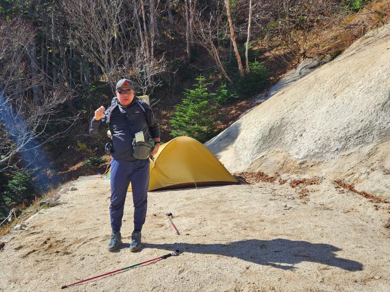 こちらのテン場はトイレが少し遠いのが厄介。テントの時は決まってトイレ近くに陣取ることが多いですが、今まで泊まった中で一番遠いように感じます。何せトイレは小屋の傍なので、小屋近くまで細い山道を下らなければなりません。夜はヘッドランプで照らした狭い道を注意深く進み、上手くかわさないとぶつかってしまう太枝のトラップをくぐり抜け、2mほどの梯子を下りてようやくたどり着けます。トイレをもよおした時に、そのまま寝過ごしてしまおうか、グダグダ考えずに一思いに下るか、寝袋の中で悩むこと数分、出発の時間までこんなことを数回繰り返すうちに度胸がつき、最後のほうは太枝トラップも巧みにかわすことが出来ていました。暗闇を登り下りすることで妙な自信が生まれ、翌日の鎖場アタックも問題なく歩けました。