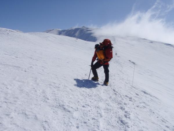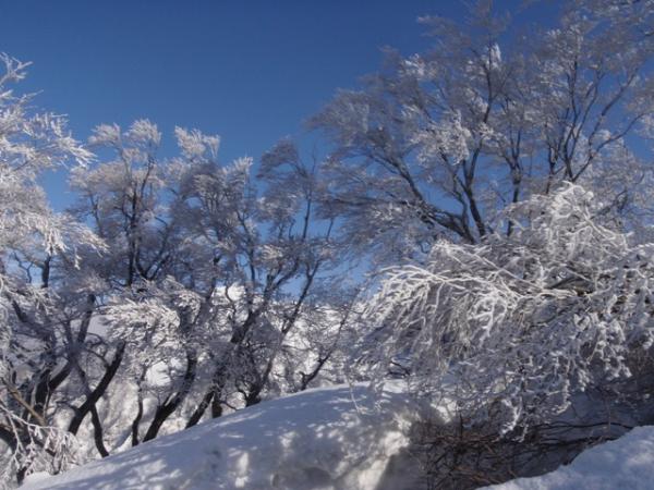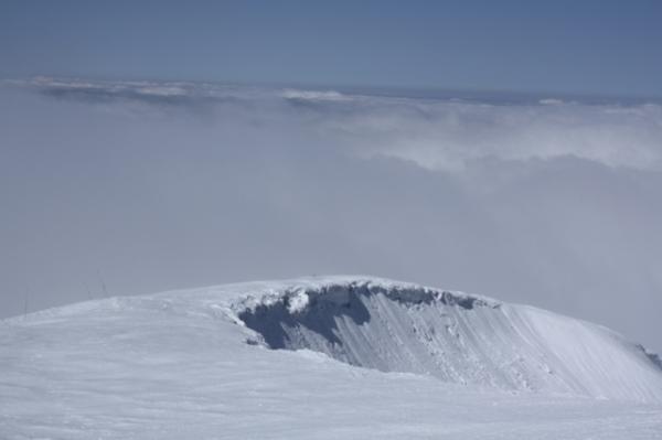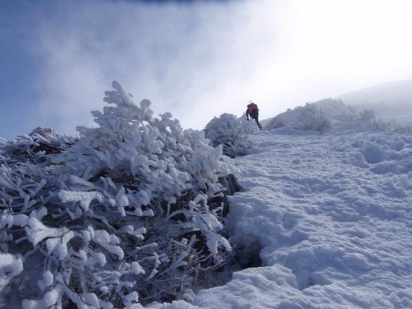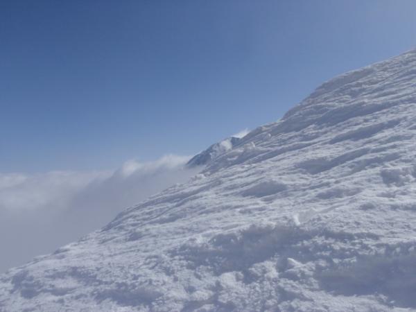 - しっかり踏み固められておりとても歩き易く、登山道のコンディションは良かったです。途中急な登りもありますのでアイゼンは10本~12本爪アイゼンをお勧めします。トレースが付いている所を歩けたので、特に危険な箇所はありませんでした。雪庇はところどころありますのでむやみにルートを外れると危険ですので注意が必要です。天気が良く歩く時は暑いですが、休憩時にとまると冷えたり、稜線に出ると風が強かったりしますので、しっかり冬山装備でお出掛け下さい。