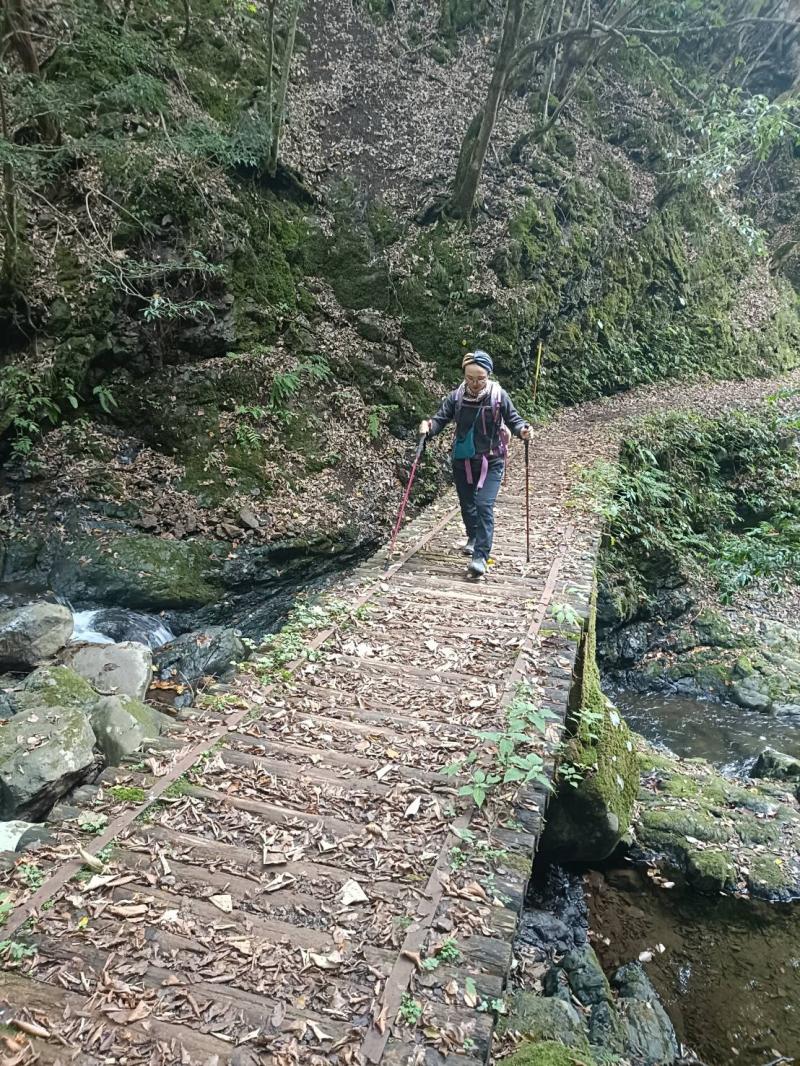 数年前より、登山道の柵や橋が綺麗になってはいますが、それでも転倒しやすい箇所は多いので、できればミドルカット以上の靴、不安な方はストックがあればよいです。