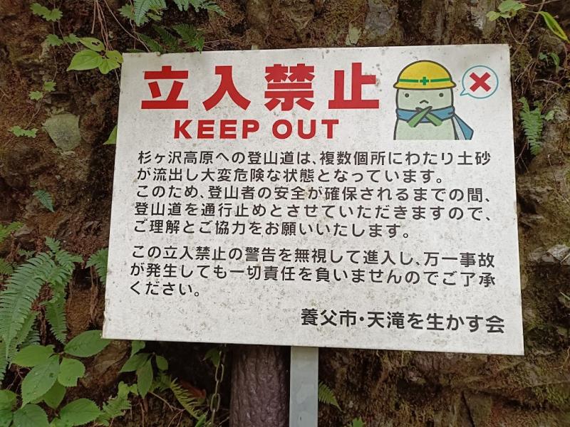 天滝から上の杉ヶ沢高原への登山道は通行禁止となっていますので、気をつけてください。