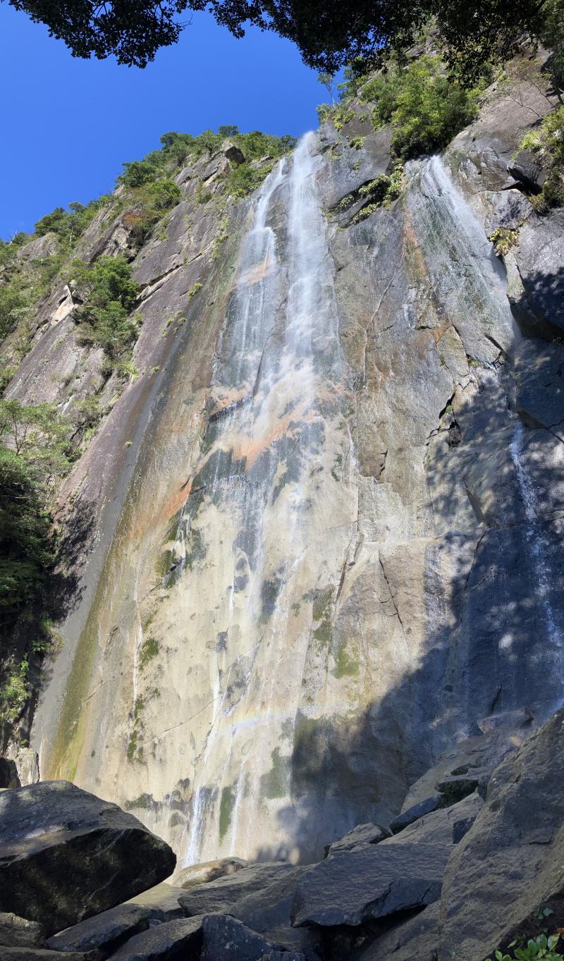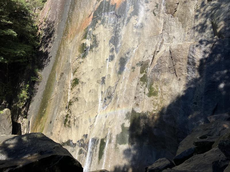 落差約77mの一枚岩を滑り落ちる迫力は圧巻で、晴天のこの日は水しぶきに虹がかかり、壮大で幻想的な光景が広がっていました。立ち寄り必須のハイライトで、私にとって、今回の山行の“ご褒美スポット”でした。