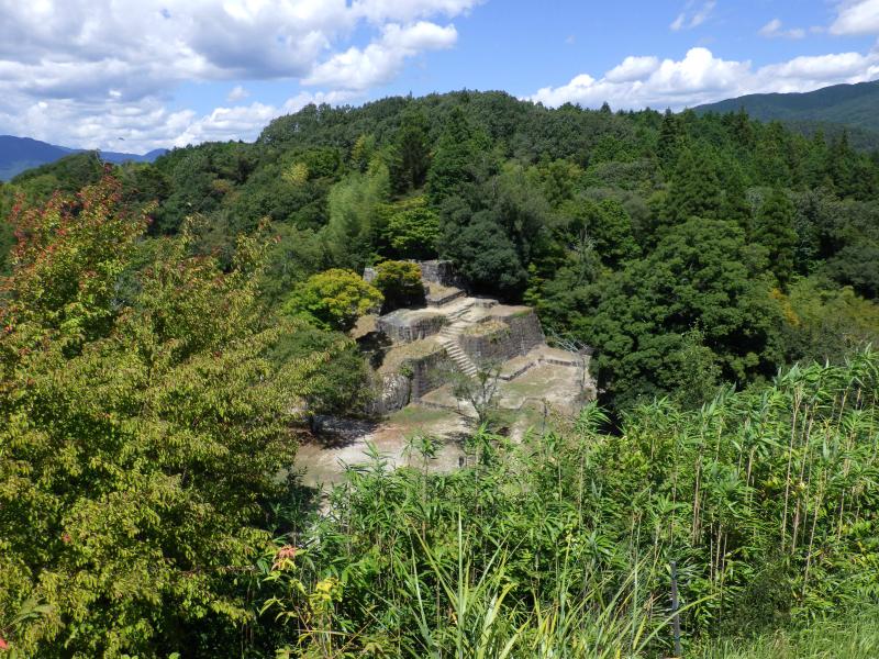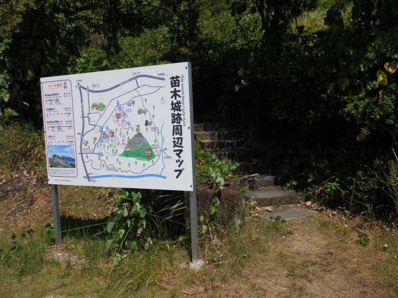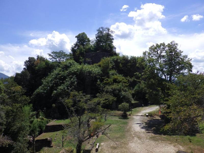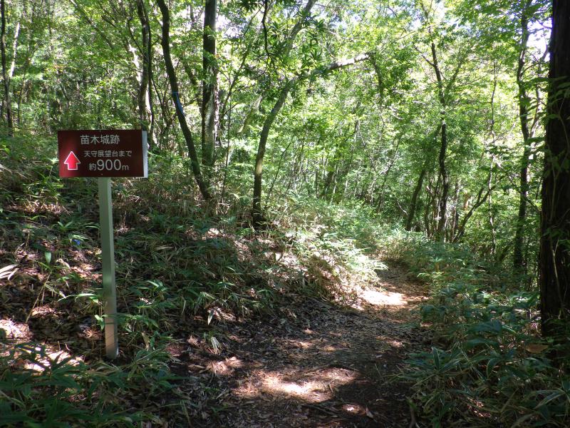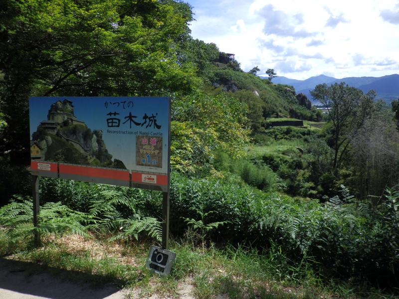 まだ暑いこの時期ですので、B1駐車場からスタート。ここからだと足軽長屋跡までは山道になりますが、樹林帯の中、歩道はしっかりしています。が、風も吹かない樹林帯はすぐに汗が吹き出します。この樹林帯を抜けると苗木遠山資料館からの歩道と合流し、目の前にには苗木城跡の小高い丘が見えます。この先は石畳の続く道に変わり、本丸の手前に大矢倉跡の石垣が現れ、少し高台になっているので、ここから天守台の眺めがいいです。
