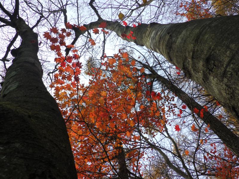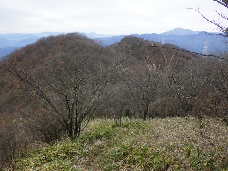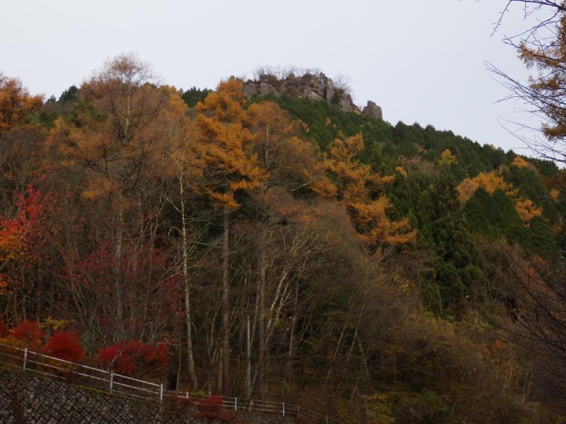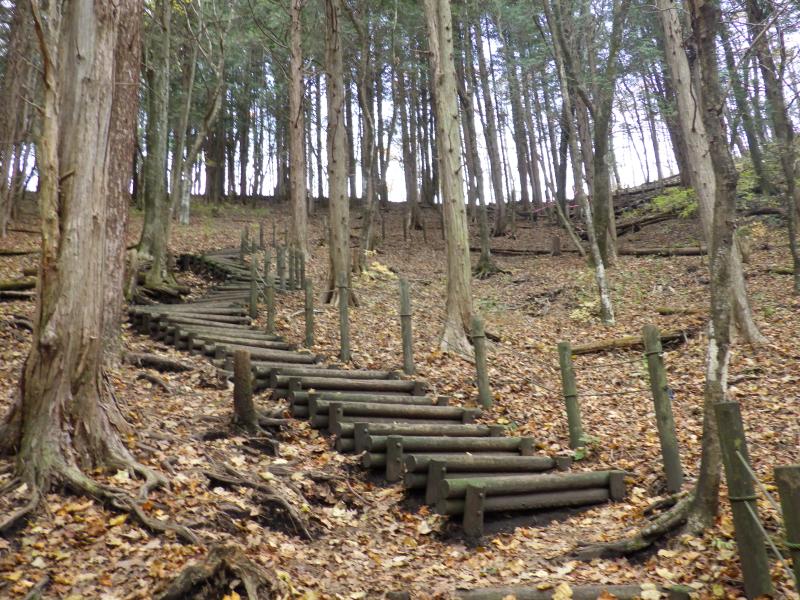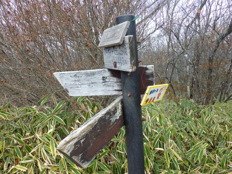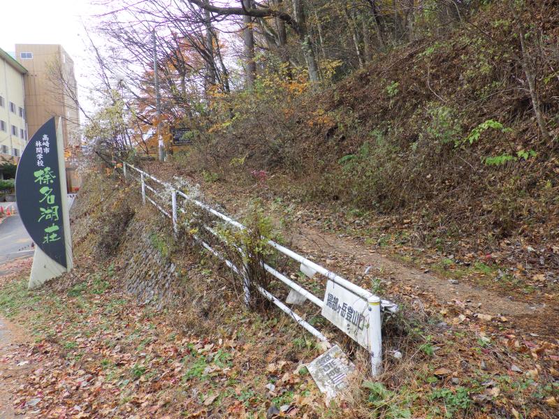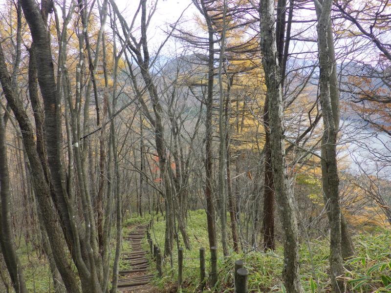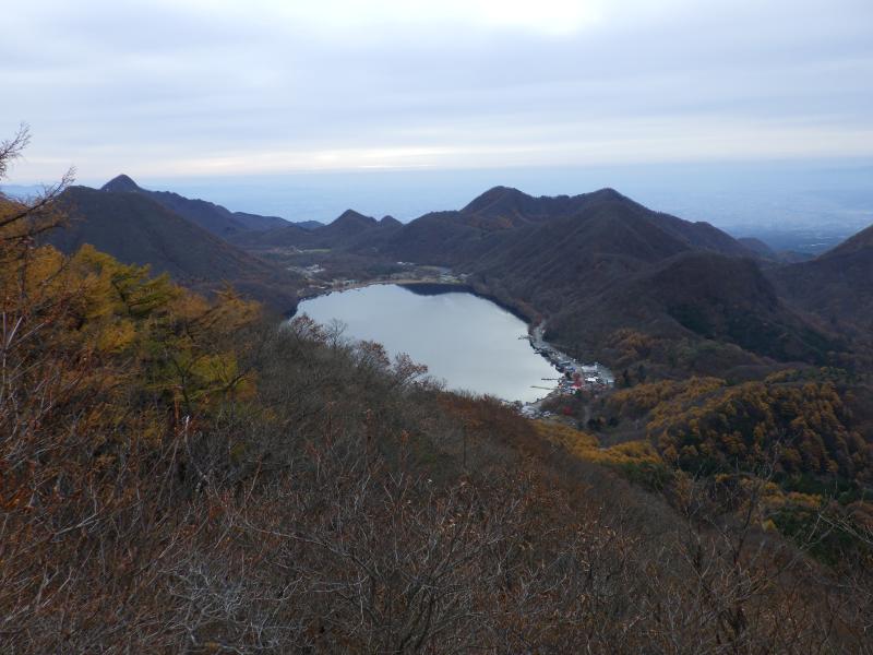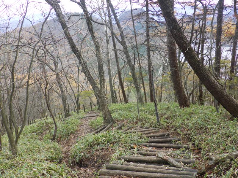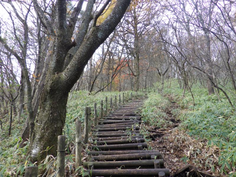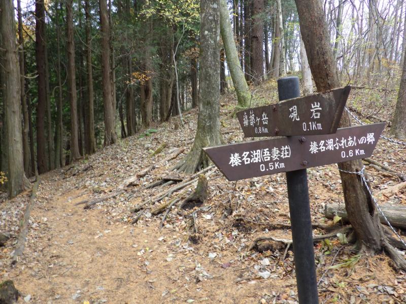 登山口は高崎市榛名湖荘を過ぎた所にある目立たない看板が目印。入口にいきなり熊注意の看板があり、目撃情報が掲載されていますので、少し警戒しながら進みます。名所の硯岩分岐まではすんなり登って来れますが、この先は細かい階段地獄が始まります。朽ち果てつつある木の階段は間隔が細かく、歩きずらい。かといって外すとクマザサの藪にはまる感じで刈ってあるとはいえ、歩きにくくなるので結局この木の階段を上がって登らないといけないという状況が結構、上まで続きます。ようやく傾斜が落ち着いた頃、展望地につき、榛名湖が見えました。上部の紅葉は終わっていますが、山麗は今が旬というところでオレンジ色の紅葉が目立つのがわかります。ここから山頂はすぐであっけなく終わりました。山頂からの展望はいまいちですのでやはり先ほどの展望地がいいようです。