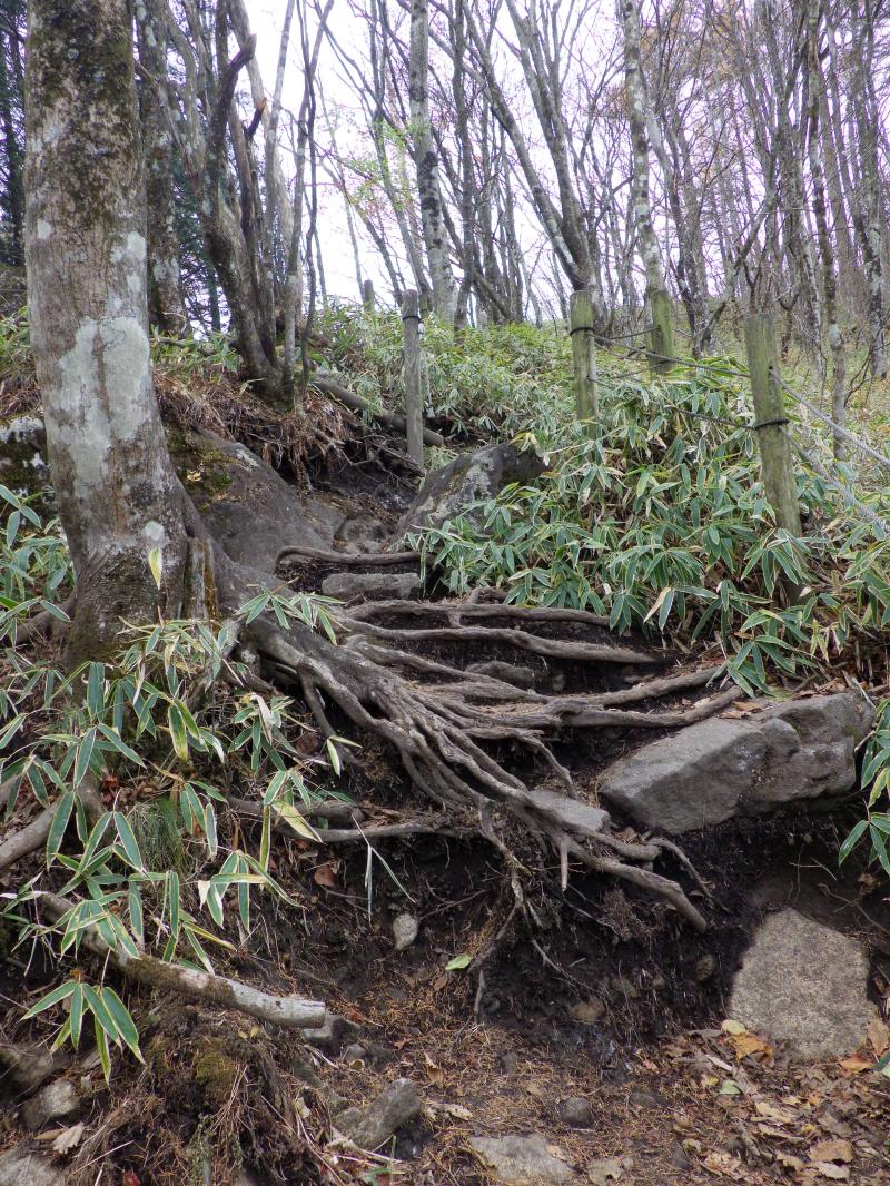 ④硯岩分岐から掃部ヶ岳へはしばらく木の階段を伴う登山道です