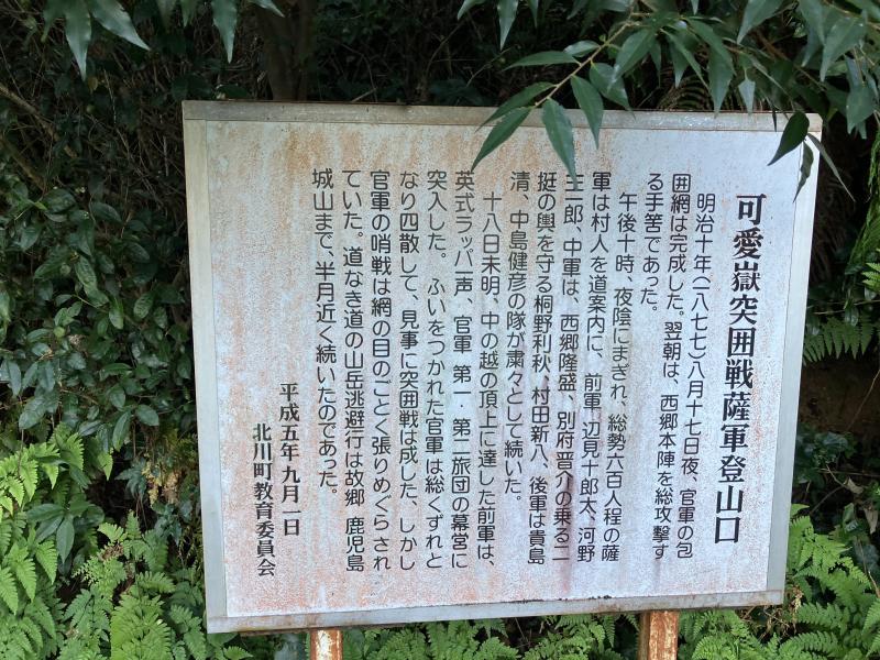 - 「延岡駅」-登山口-ひべら山-ザレの頭-水のみ場-ノゾキ展望所-鉾岩-可愛岳-鉾岩-烏帽子岳-立石-西郷隆盛資料館-「延岡駅」