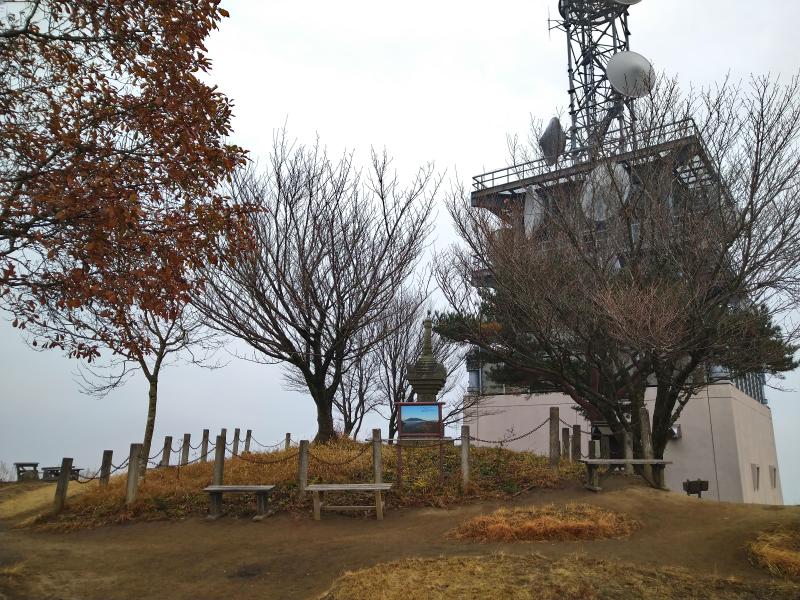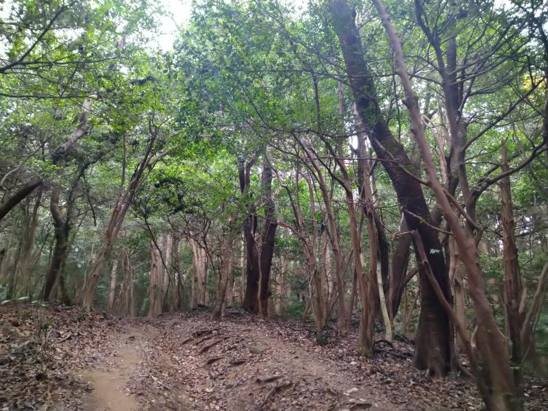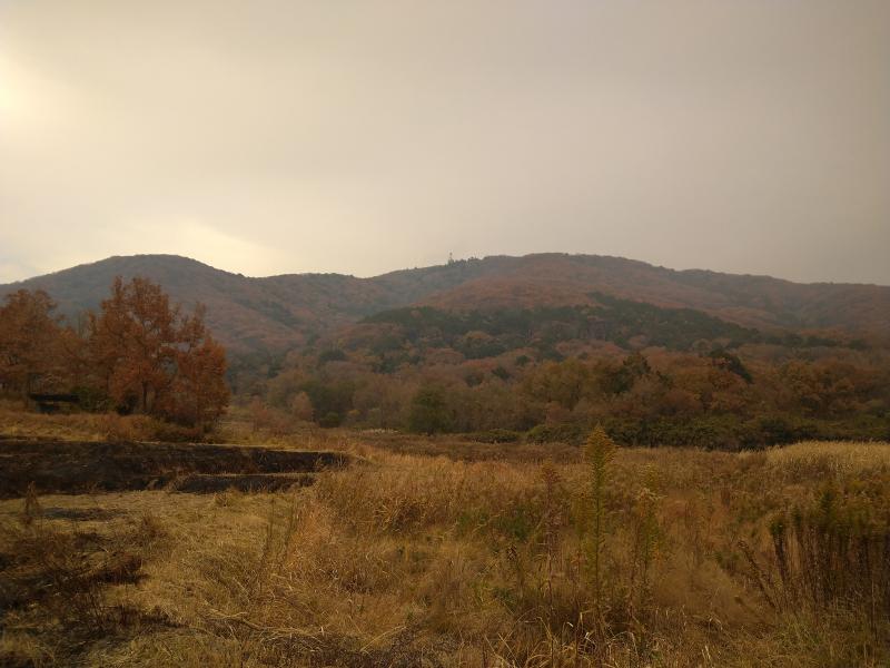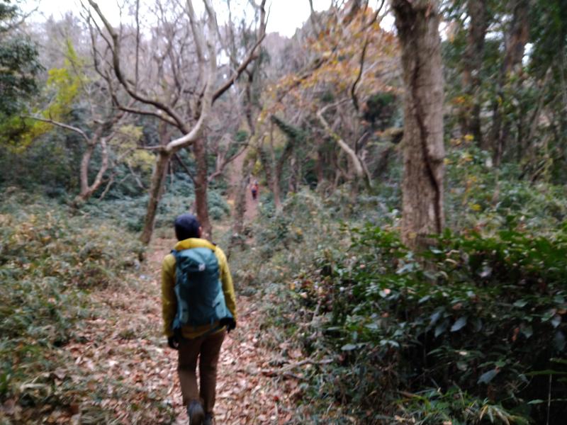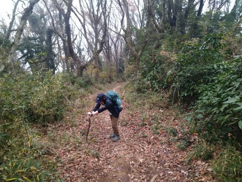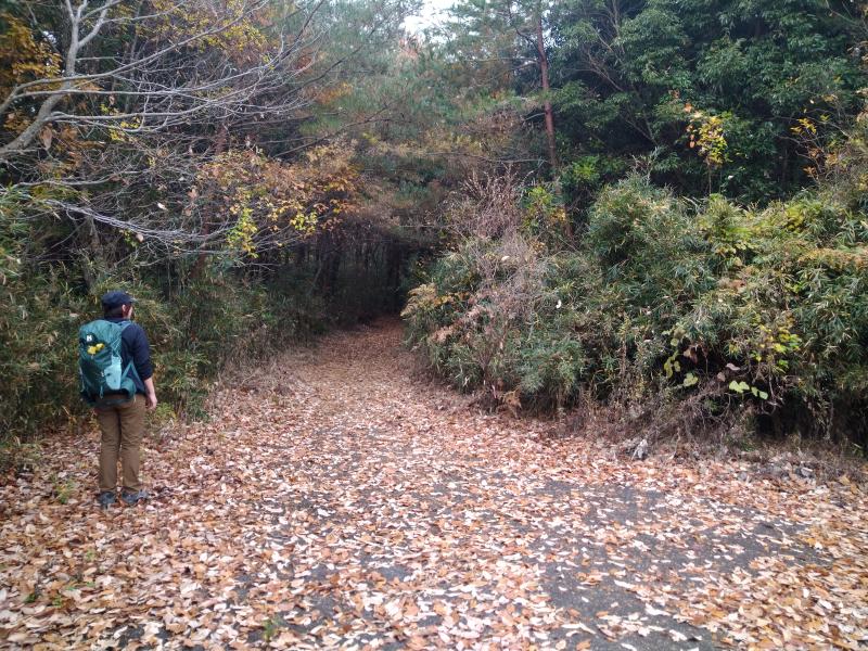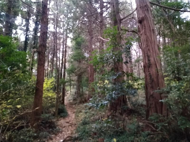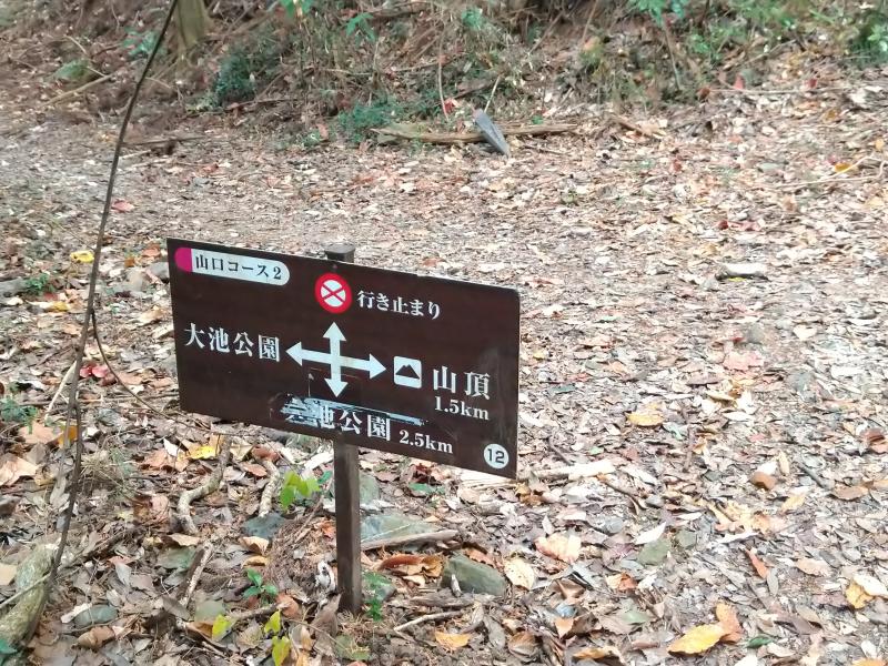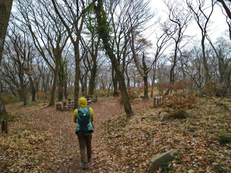 麓から山頂までの登山コースは山口1、2、新寺、小田城、極楽寺、常願寺コースの5本あり今回は、山口コース2を選択。山道に入るとはじめは緩やかな登りでしたが次第に急な登りへ変わり新寺コースと合流します。その後またゆるやかな明るい雑木林の中を歩くことになるのですが、もう少し早ければ紅葉も楽しめ多様な雰囲気でした。また、急坂が続くようになると間もなく山頂。