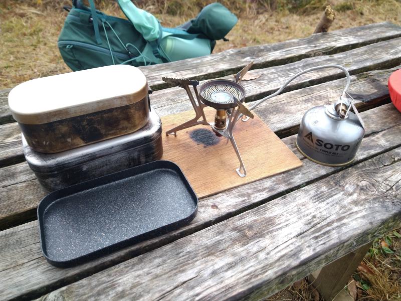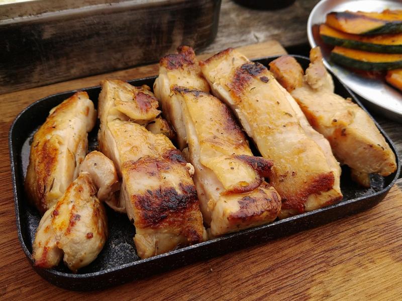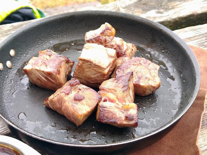 比較的フラットなテーブルを選び、ごはんの準備です。持参したお米をまず炊きます。強火で沸騰をさせて沸いたら弱火にして15分程。あとは水分の残りを見ながら微調整。炊き上がるころに今度はフライパンでお肉を焼きます。火加減を調整しつつまずは「チキンの香草レモン焼き」を焼いて余熱を使いつつ柔らかく火を入れます。そして次は「ヒレ肉」こちらも火加減に気をつけながら美味しく焼けました。
