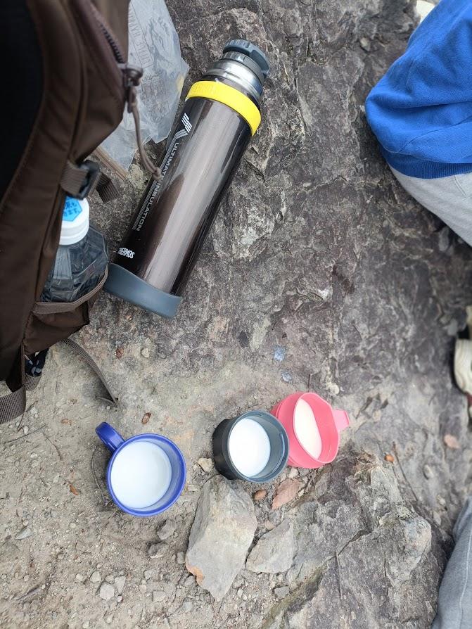 山頂で山専ボトルに入れていったホットミルクとチョコレートで休憩。