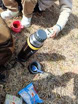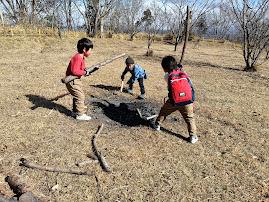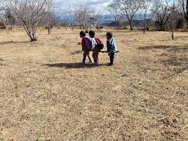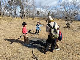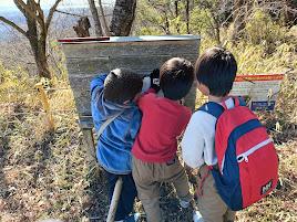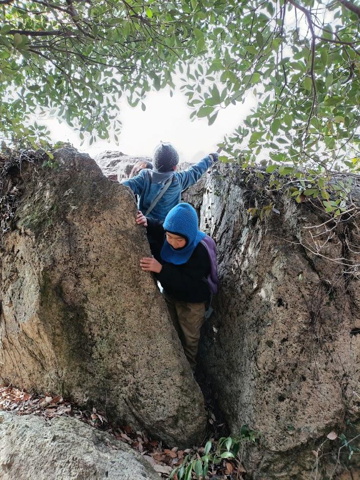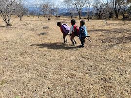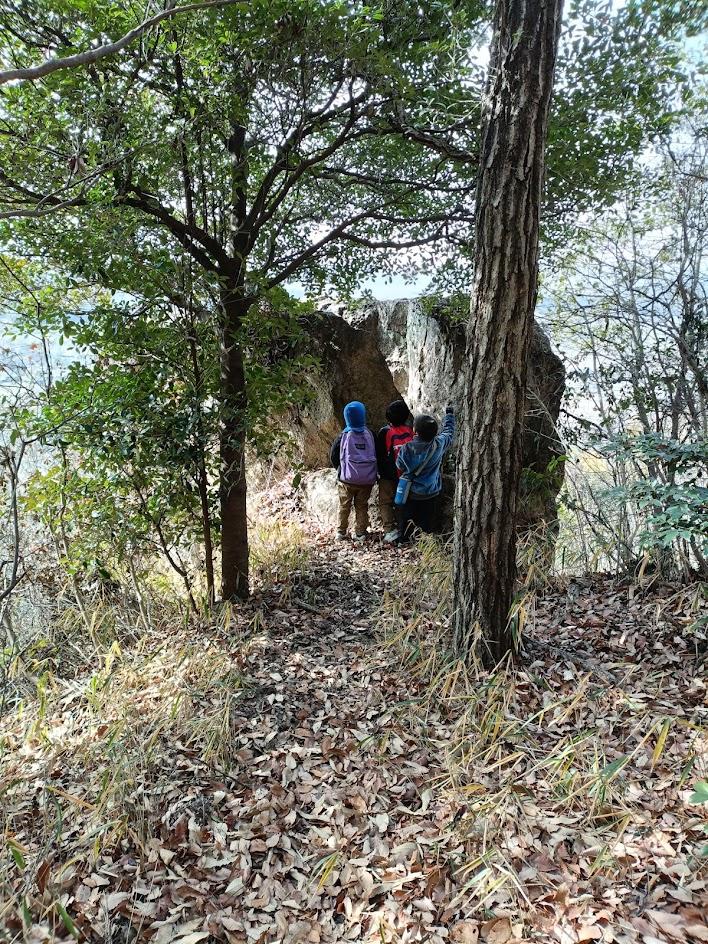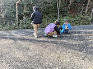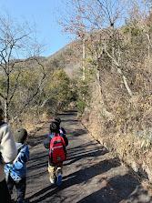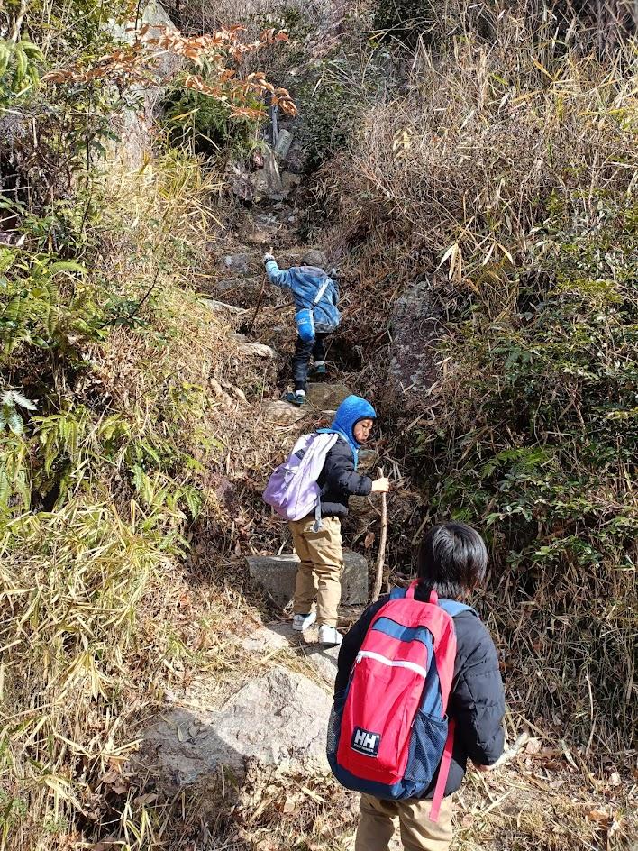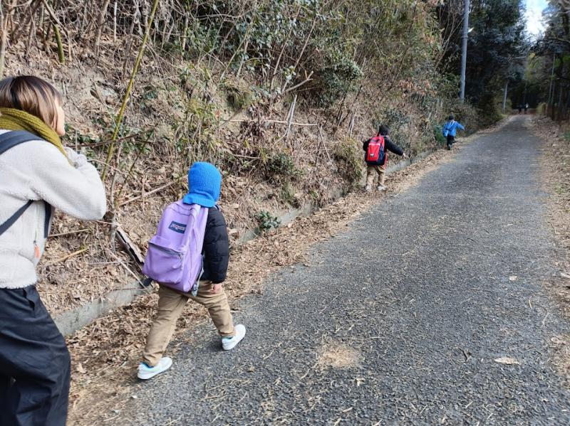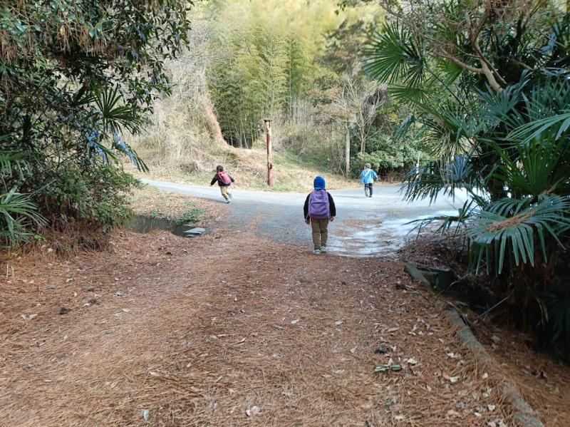 粉雪の舞う寒さでしたが山の中の道は温かく、子供たち上着を脱いでいました。