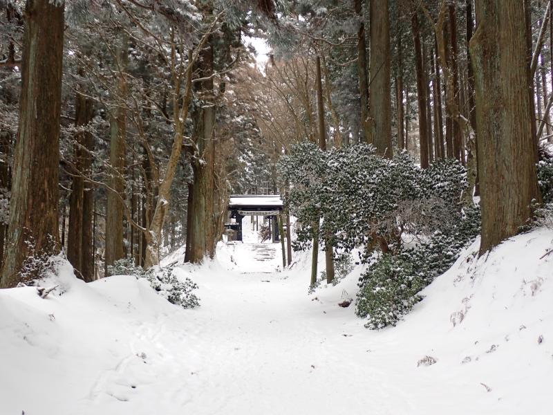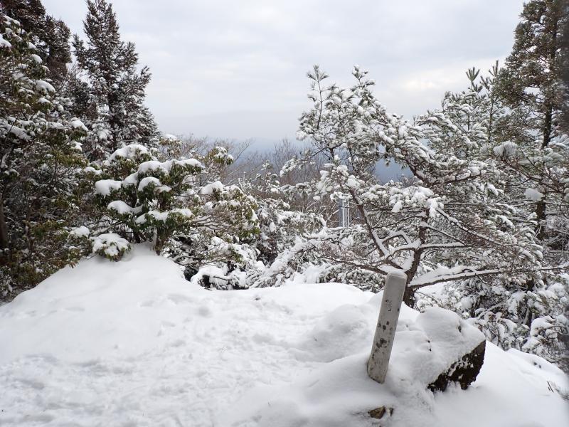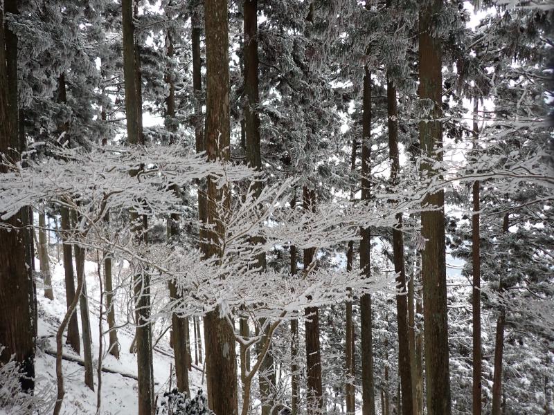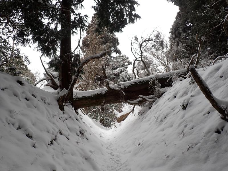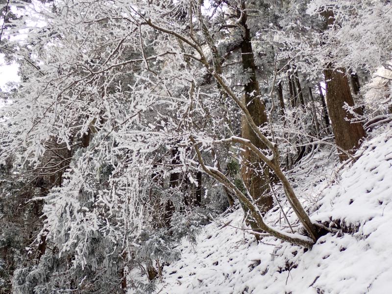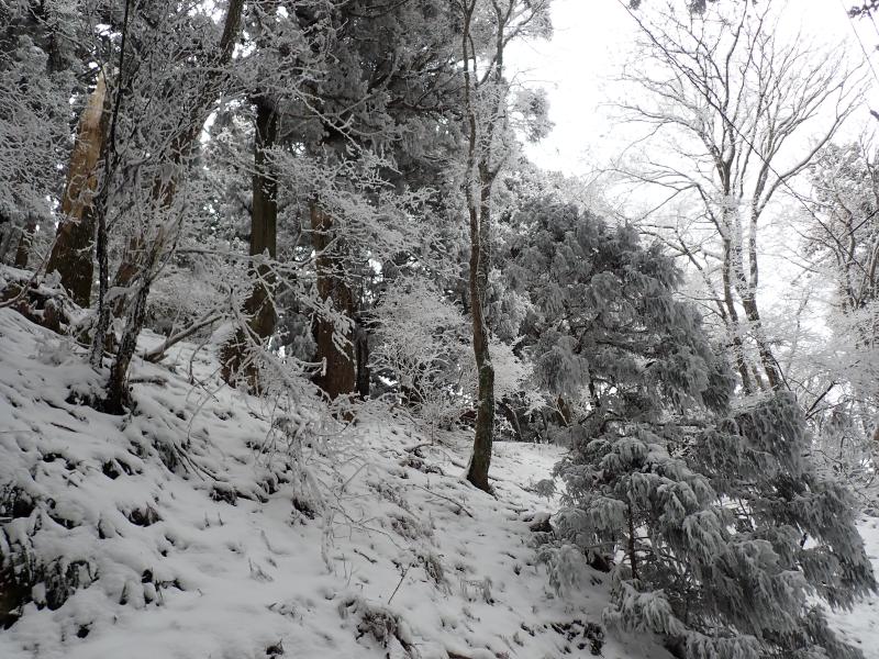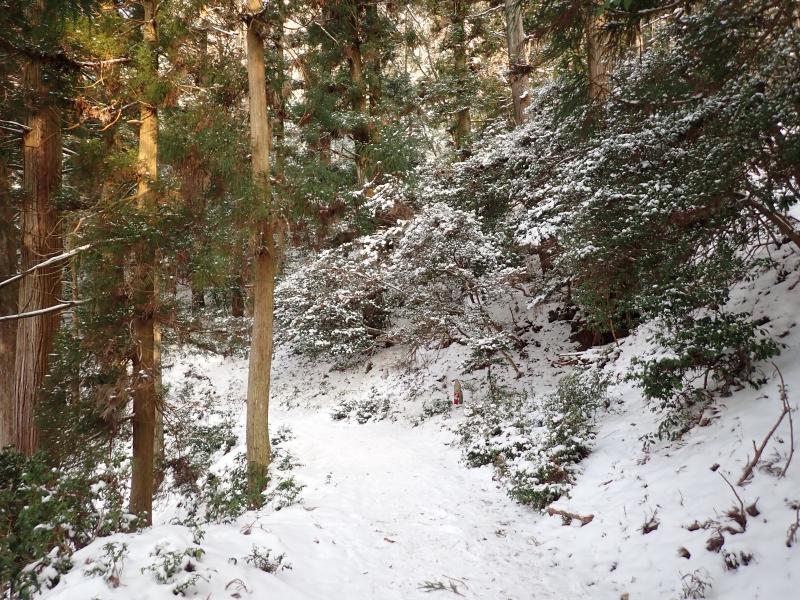 当日の日中気温が10度の予報だったため、日の出と同時に清滝を出発。気温0度で暖かく、中腹近くまでベースレイヤーと長袖シャツだけで登りました。「三十丁目 水口屋跡」でー8度になったので、レインジャケットを着用。この付近から、完全な雪道になりました。