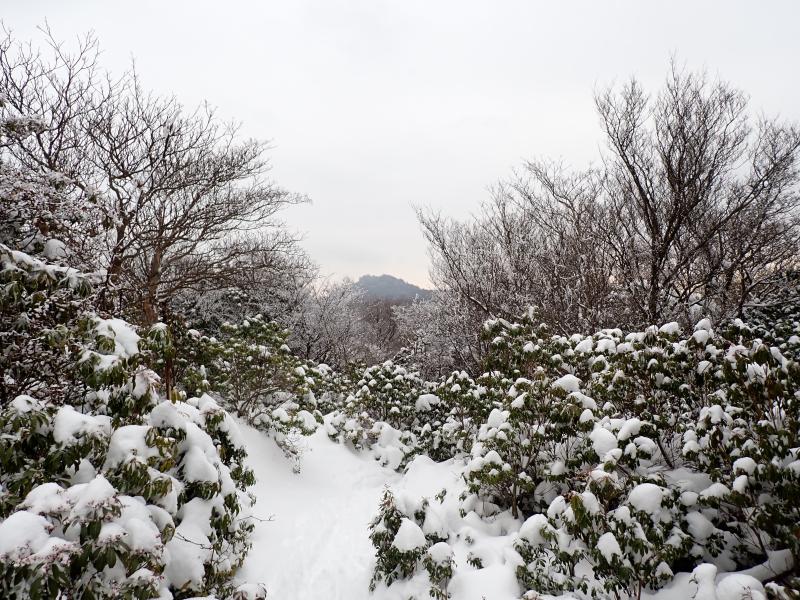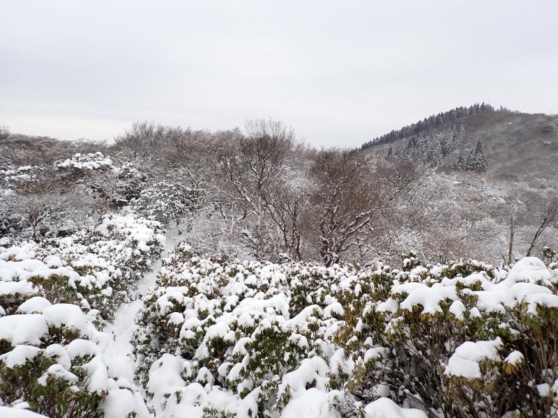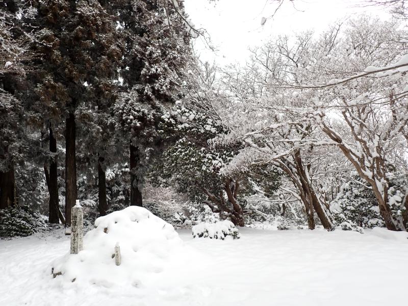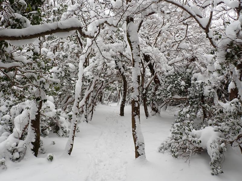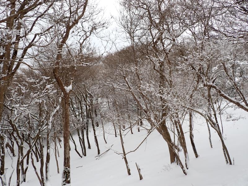 地蔵山への道中は、低木の枝に雪の塊がたくさん乗っており腰を屈めて通過する場所が多いですが、この雪が溶け始めると落雪地獄になります。なるべく快晴でない日や、早朝に出発すると落雪を回避できますので、ご参考下さい。出発から3時間半かかって地蔵山に到着。気温ー5度で無風なので快適でした。