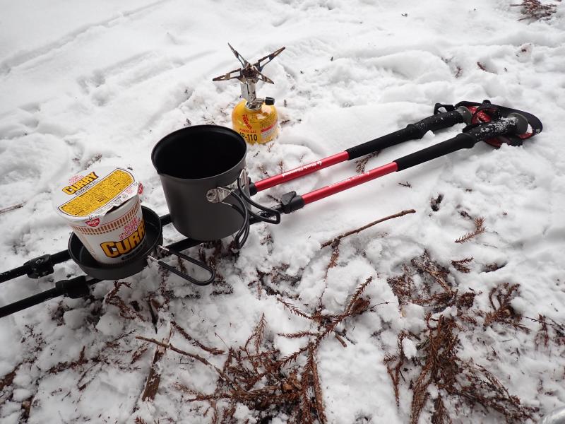 水尾分かれでアイゼンを装着して、愛宕神社の長い階段下の休憩小屋へ。今回は裏愛宕の地蔵山へ足を延ばす為、ここで軽く腹ごしらえし防寒対策してから出発。積雪は15~25cmぐらいでしたが、機動力を上げるためワカンを装着して地蔵山へ。