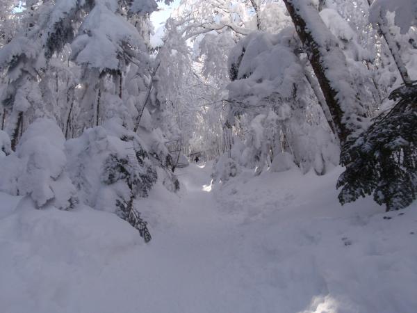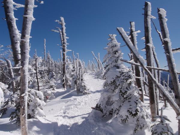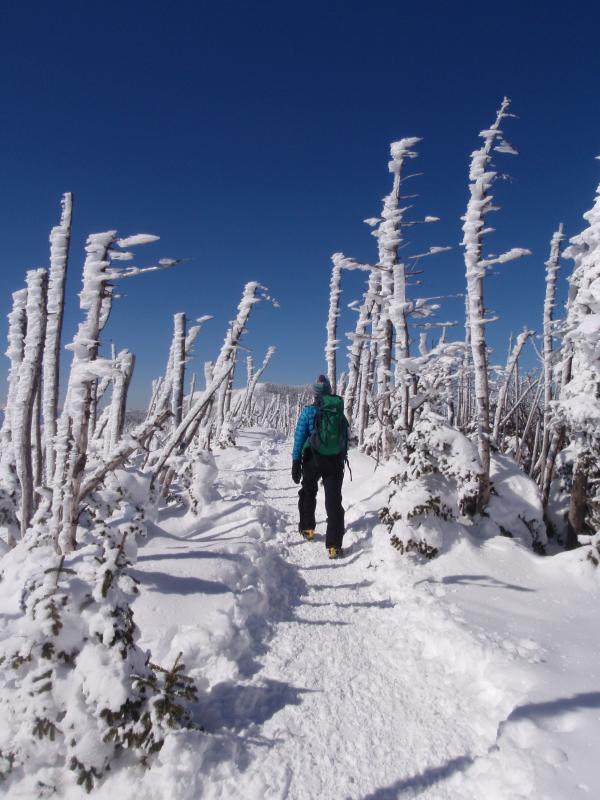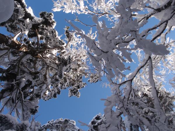 晴天の日、木漏れ日が差す樹氷の森は一層美しさを増し、木々の間から青空を見上げれば、そのコントラストに心を奪われる。
