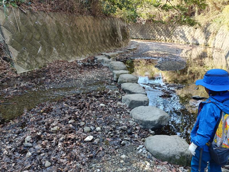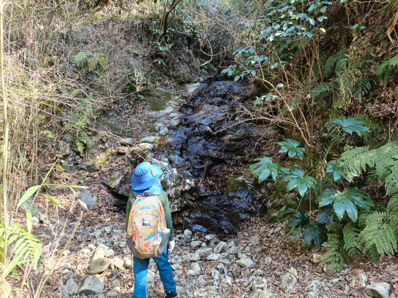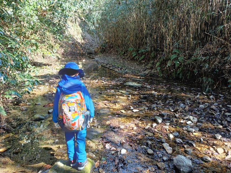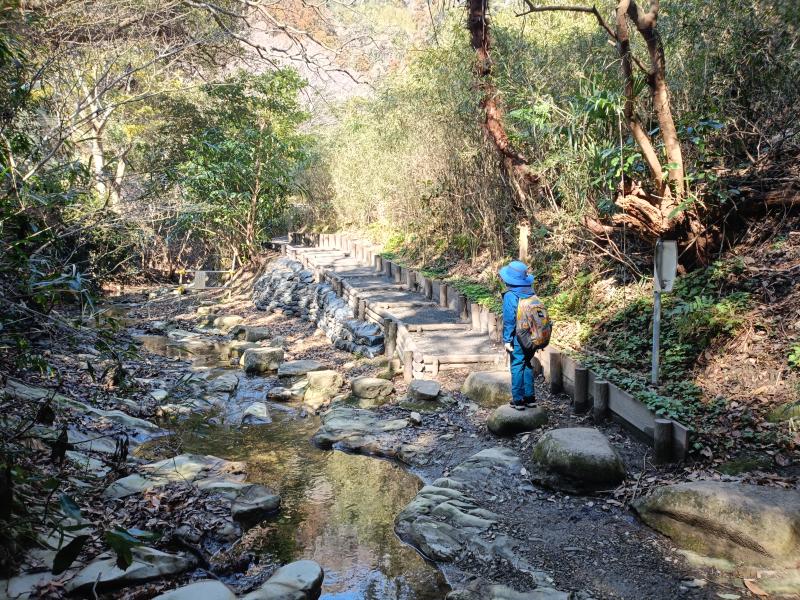 前田川遊歩道までは5分程度と近く、渓流沿いのハイキングがすぐに楽しめます。飛び石、経路が整備されていて初めての方や子供連れでも比較的歩きやすい道となります。スニーカーでも歩けますが大楠山に登るならハイキングブーツがオススメです。この日はフキノトウを探しに来たので崩壊して通行困難になっている後半部分にそのまま進みます。この部分は、ハイキング気分では歩けませんので安易に進むのは控えていただいたほうがよいと思います。(流れを跨ぐように踏ん張って子供を抱きかかえたり、そのまま歩いたりしました。)