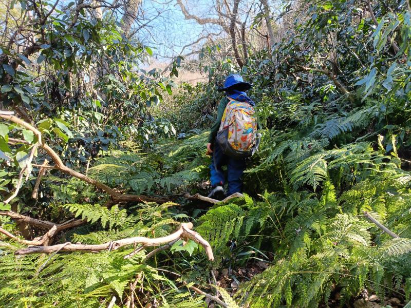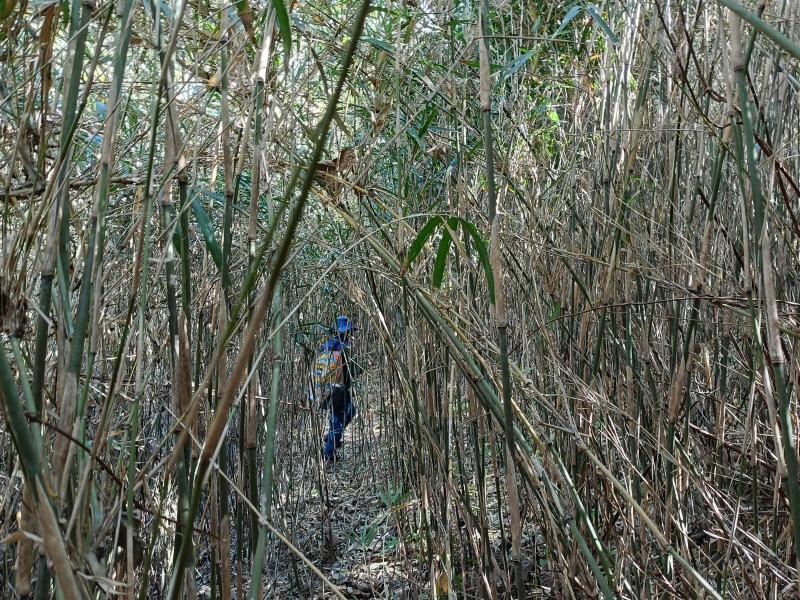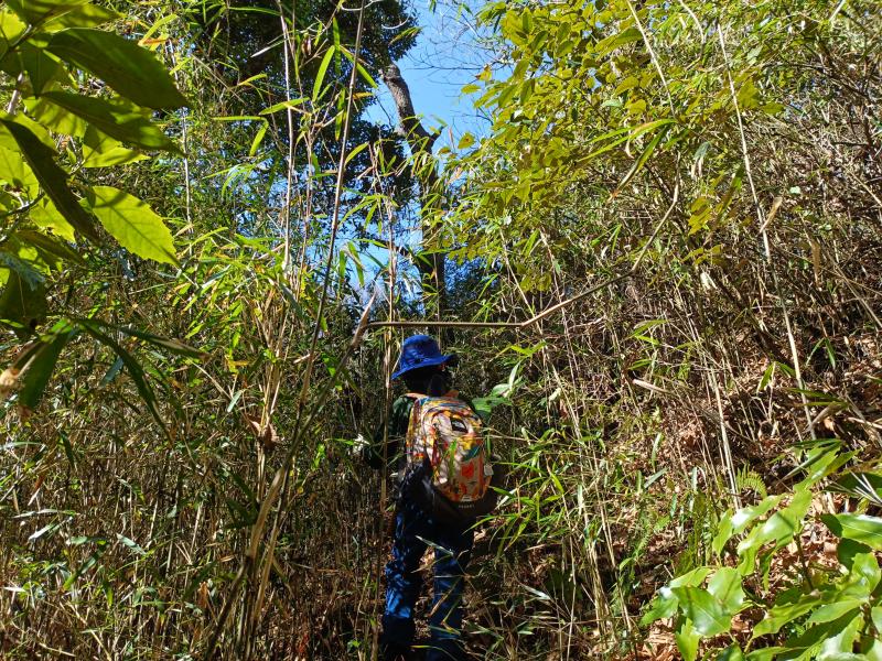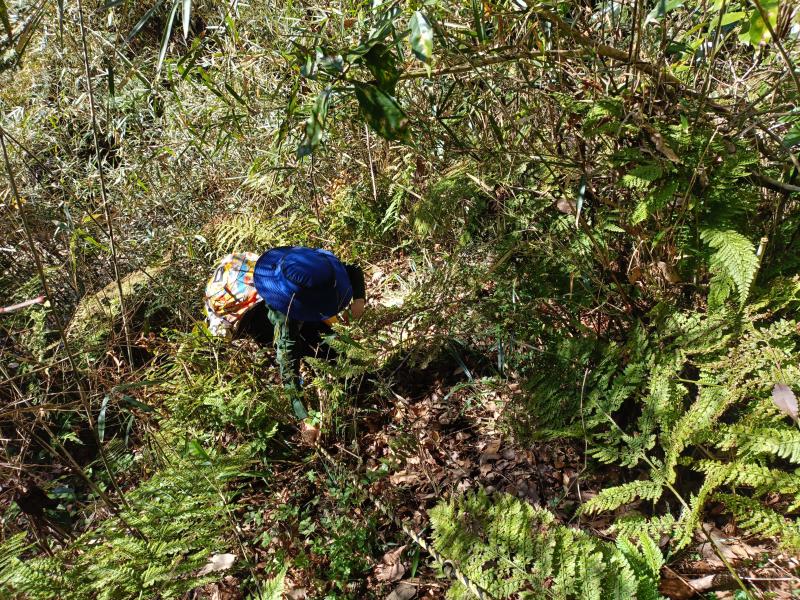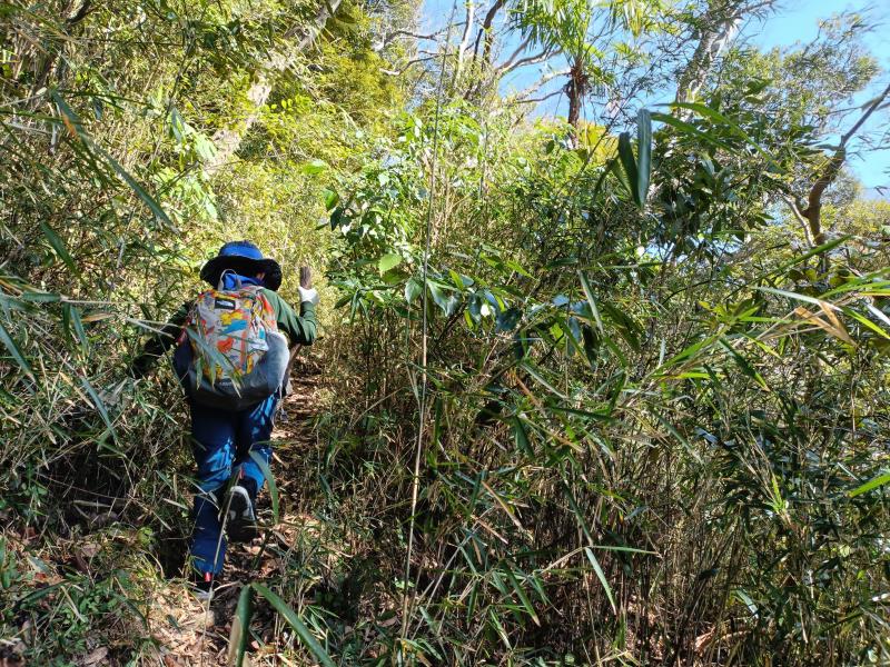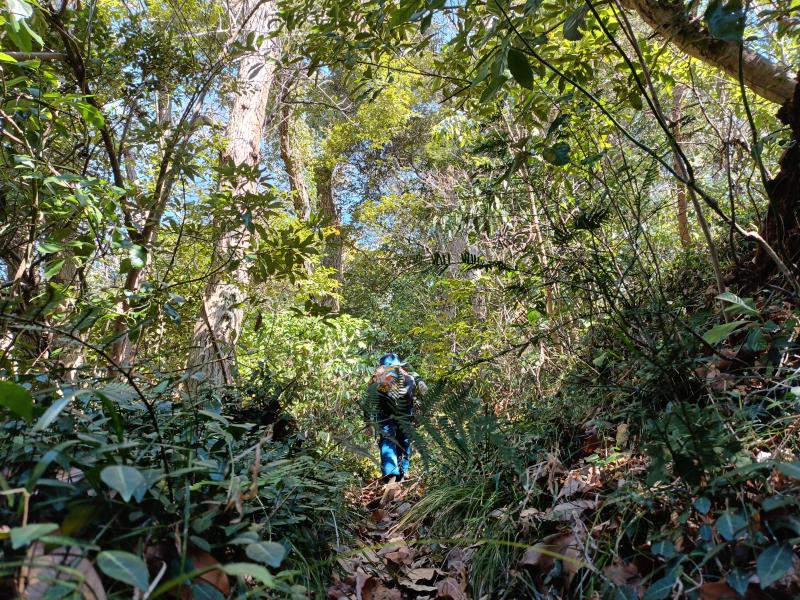 滝前で小休止を挟み登りだしましたが、子は薮っぽい急な斜面にちょっと苦労していました。その後も入山者が減ったのか荒れて薮っぽくなり、このまま完全に廃道になるのではないだろうか?と言う感じでした。40分程で大楠平の端っこに入ったのですが笹の生育が良く笹薮に…