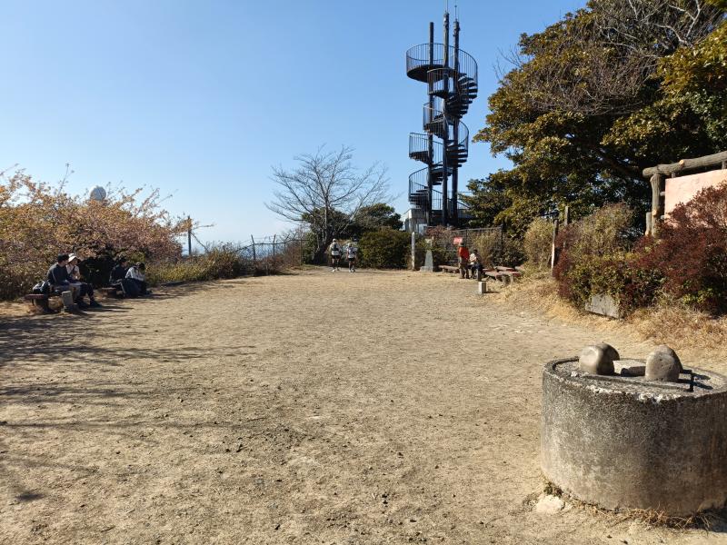 レーダー塔横の展望台に登り、空いていたのでベンチでお昼休憩。海ビューを楽しみながら朝用意してきたおにぎりと唐揚げ、ウインナー、卵焼玉子きなどのお弁当でお腹を満たして山頂へ。以前は、山頂の展望台にも登れたのですが老朽化でレストハウスと共に閉鎖になり、取り壊しを待っている状態です。