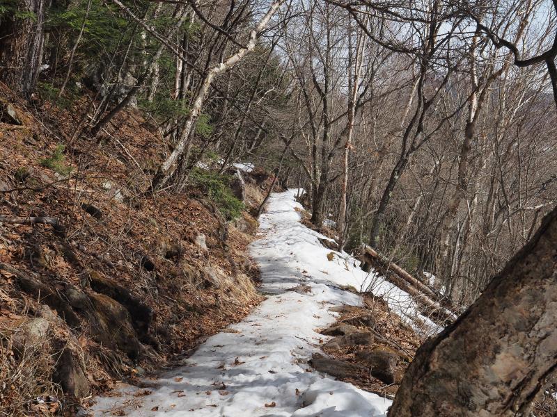 北アルプス方面はちょっと霞んでうっすらとしか見えず残念。夜から天気悪くなるからかな?鞍部への下りはチェーンスパイクを装着。烏帽子岳には行かず登山口へ戻ります。南側の道はさすがに雪が少なく一部はもう土が出ていました。今シーズンはスキー場も雪が少ない印象ですし、少し南側に来ると尚更減りますね。