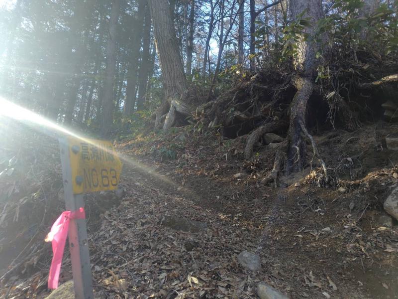 ⑤送電線NO63鉄塔下までははっきりしているが、この先はクマザサで登山道がやや隠れていました。雪が出てくるまでは若干の凍結具合