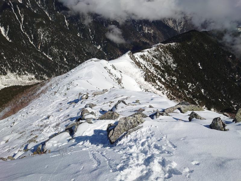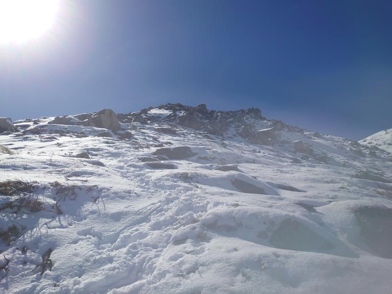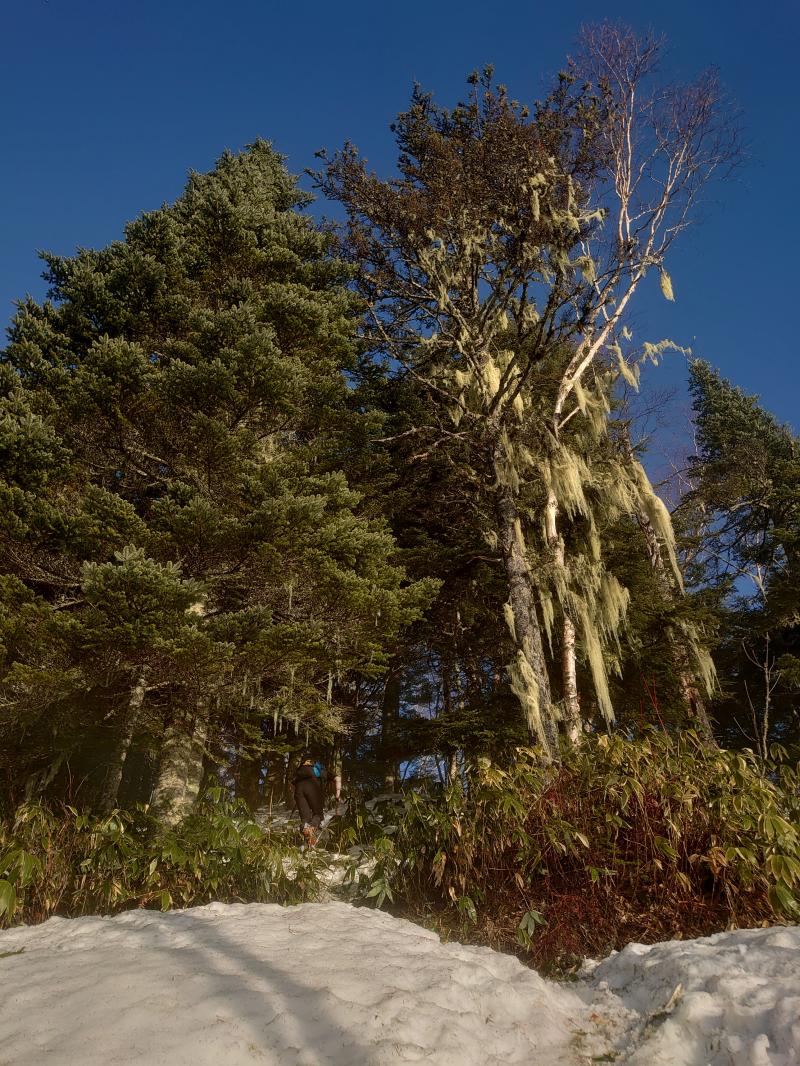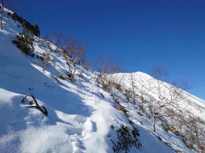 ⑪岩場通過地点、岩峰を巻くようにトレースがつけられていました。雪が深くなく、ハイマツや岩に引っ掛かります