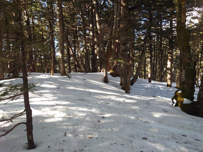 ⑥左からくる林道終点からP1955mまでは急な樹林帯で雪はしっかりついています