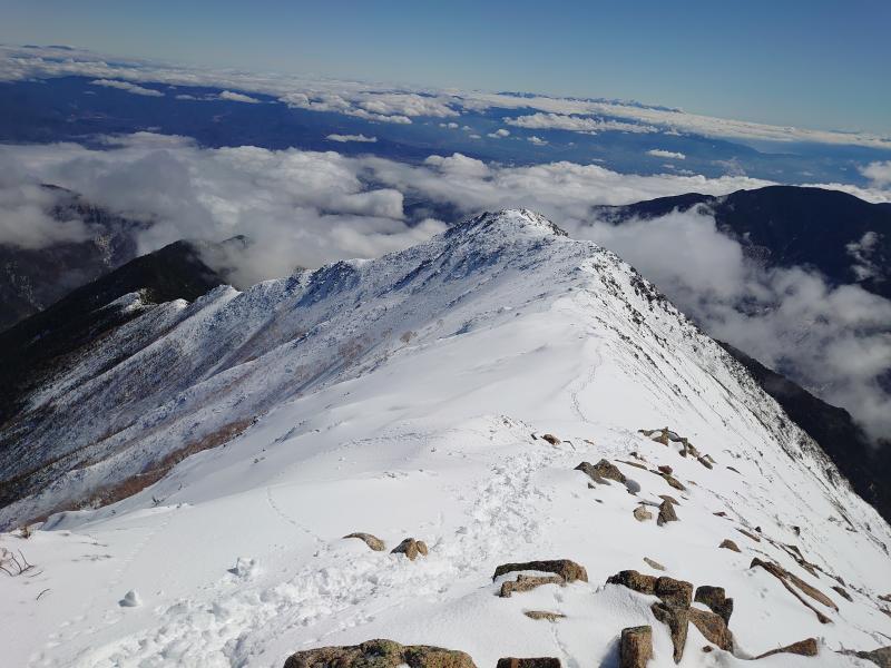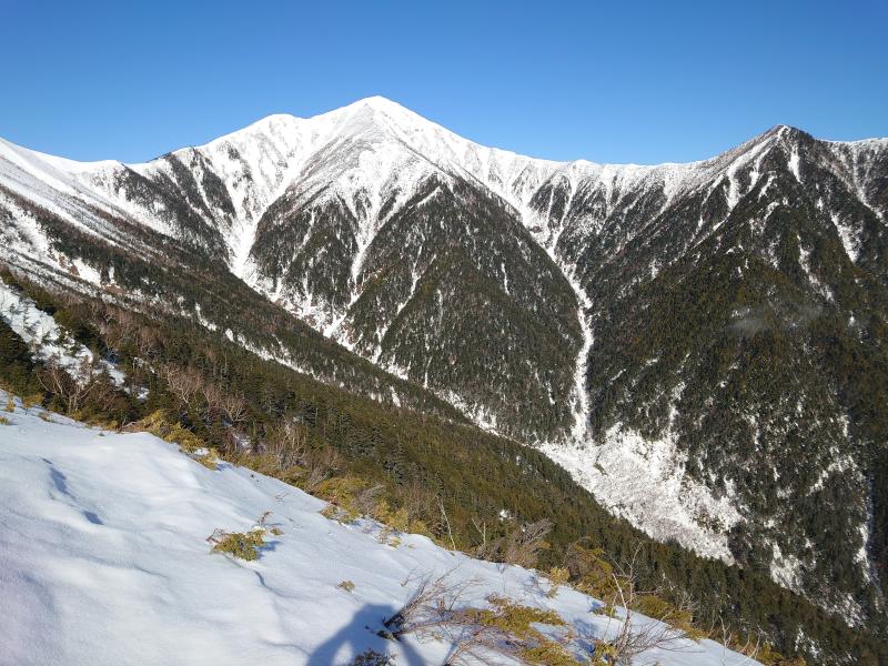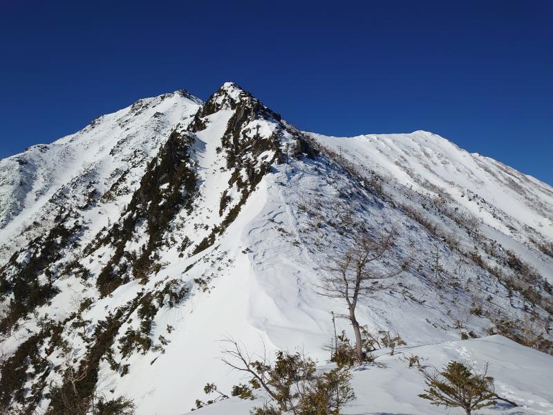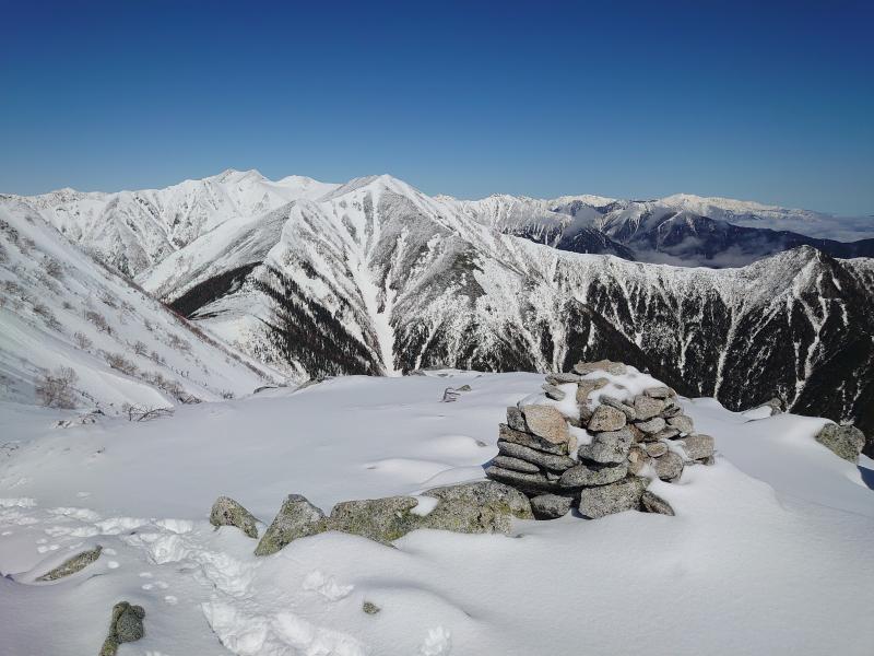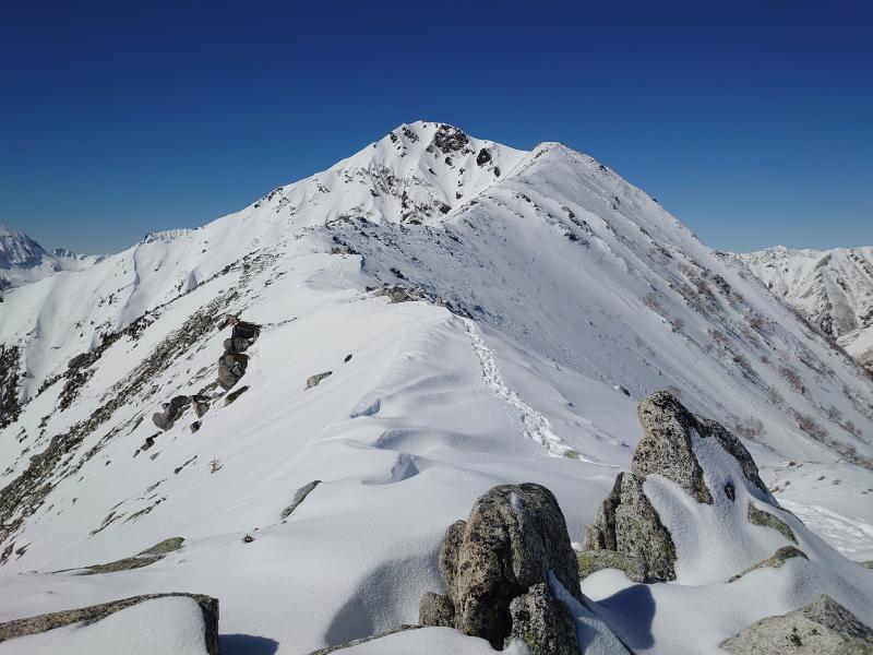 序盤、1955mピークまでが樹林帯の急坂で、序盤は雪のない笹原だが、しばらくで雪道に変わり、トレース通りに進みます。1955mピークから少し下ると遠くて絶望感のある常念が姿を現します。地図ではここからはしばらく傾斜が緩やかになり、2178mピーク、そして森林限界と進んでいきますが、この辺りまで陽が当たらない樹林帯で快適に進めます。森林限界に出てもほぼ無風だが、暑くもない絶好のコンデションでテンションがあがります。やや細くなる尾根ですが、雪庇もなく、岩場にさしかかりますので、ここでアイゼンを装着します。トレースは岩場を巻くように一の沢側にトラバースしていて、上部は岩場を越えて行きますが、岩に薄く雪が付いていると思い際、ハイマツだったりして歩きにくい。前常念の手前くらいで2時出発の方とすれ違い、早さを感じました。11時までに前常念いついていないと難しくなるのでばてながら急いだ結果、何とか11時前に到着。ここまで7時間も費やし、下部樹林帯で時間がかかり過ぎました。