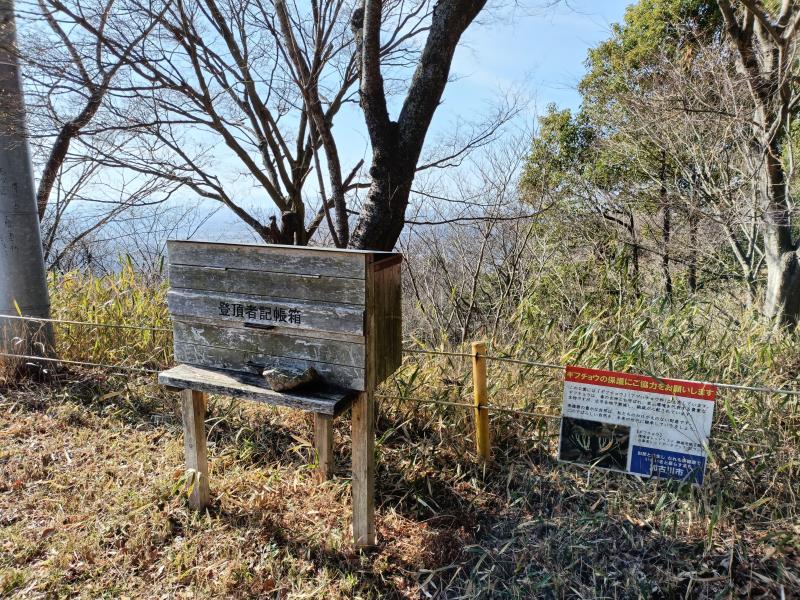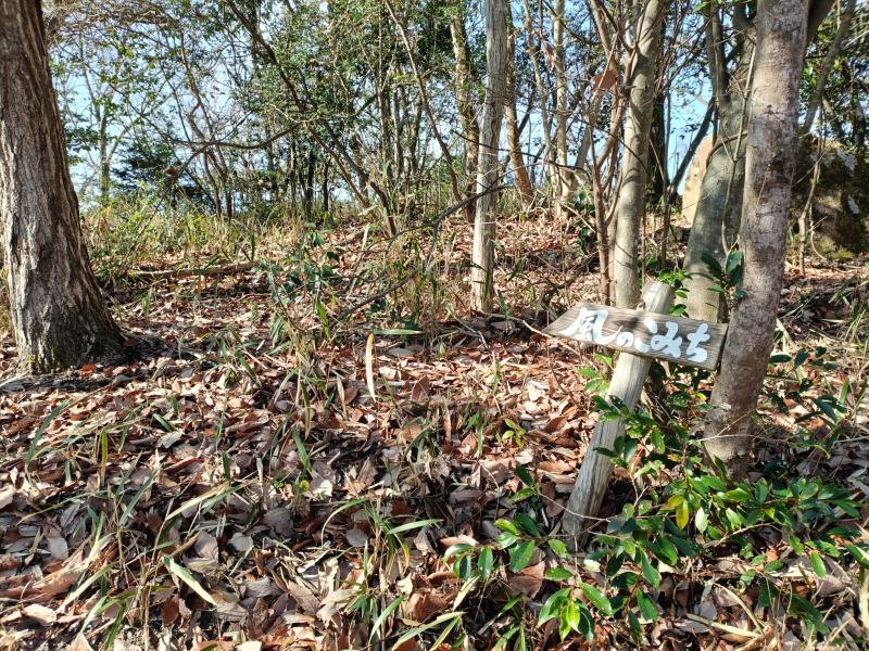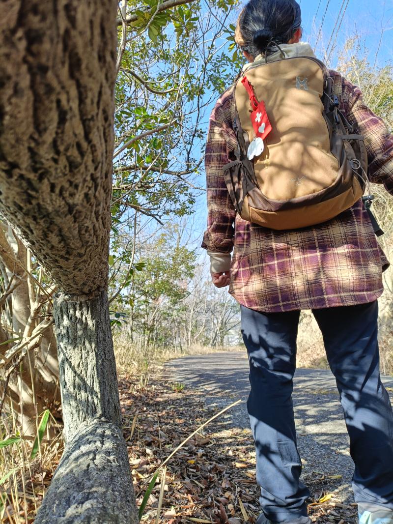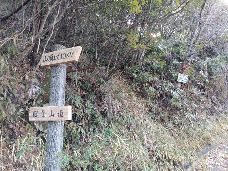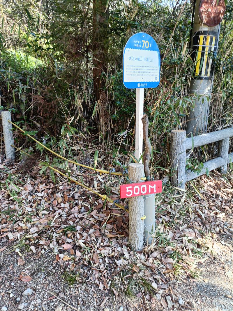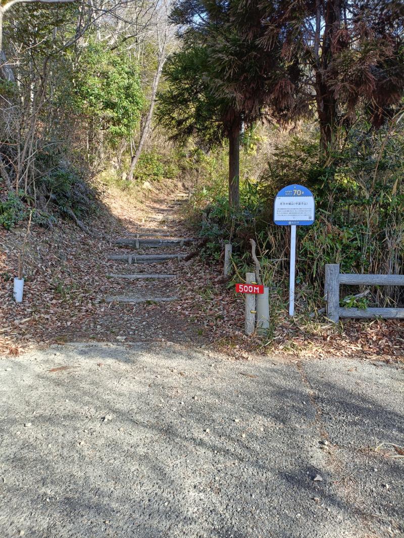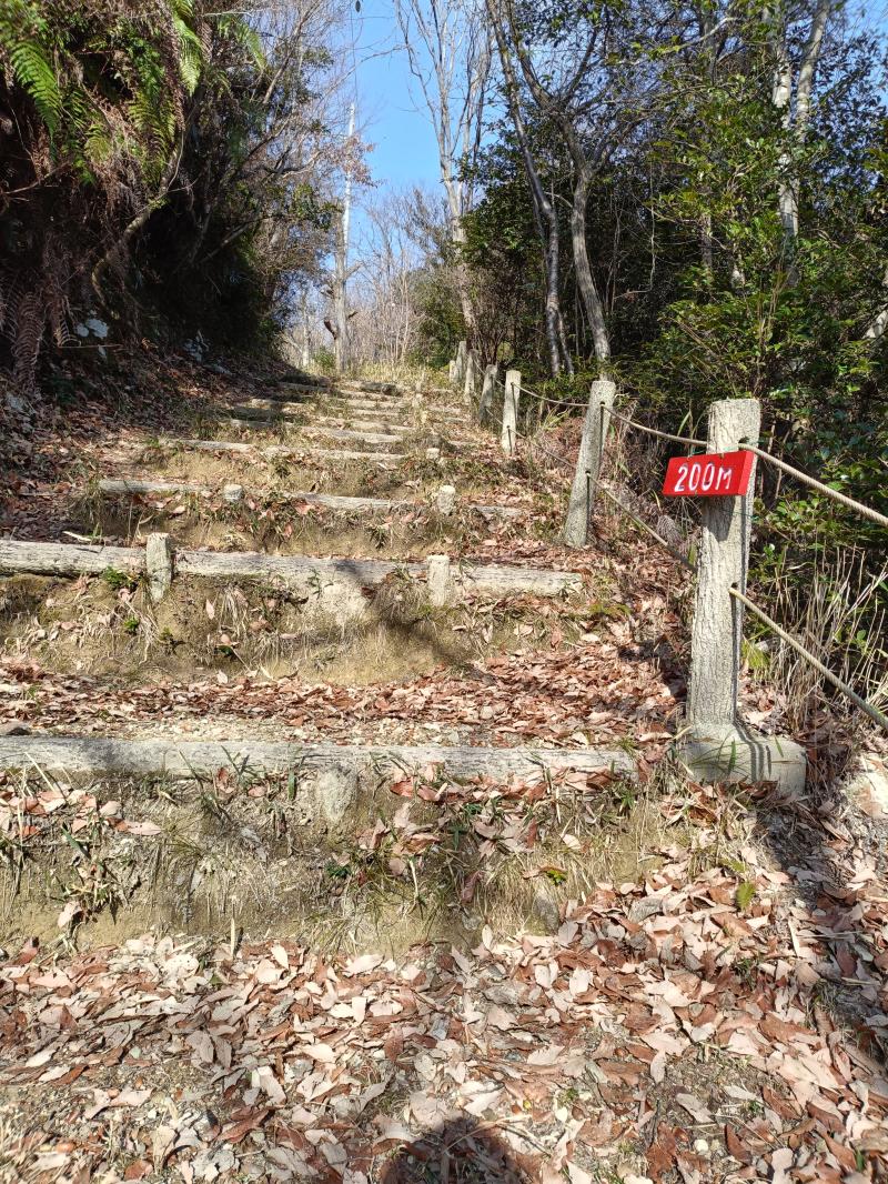 - 今回は階段コースの往復でした。アスファルトの落ち葉は2カ月前よりかなり減っていました。階段道には、山頂まで何メートルの看板が目立ちます。
