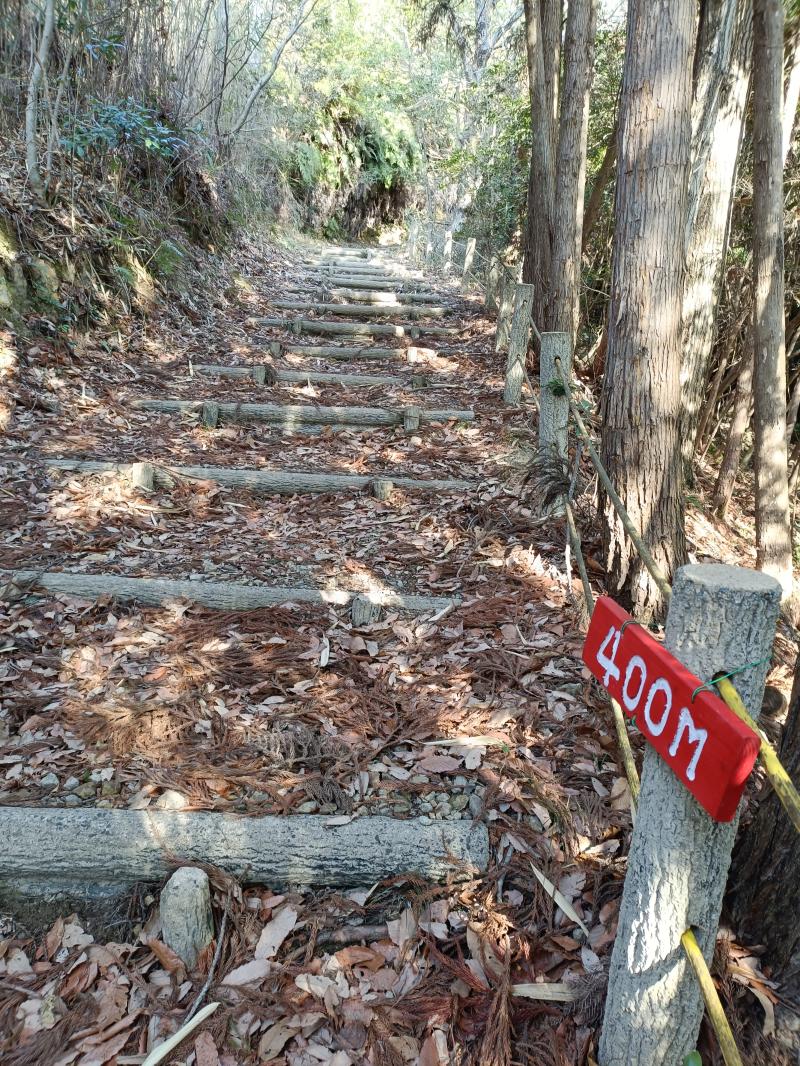 階段はそんなに大きな段差はないです。片側の柵に、400m,300mと赤い札が励ましてくれます。