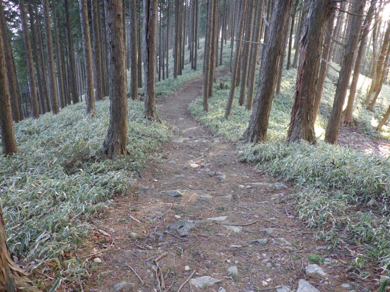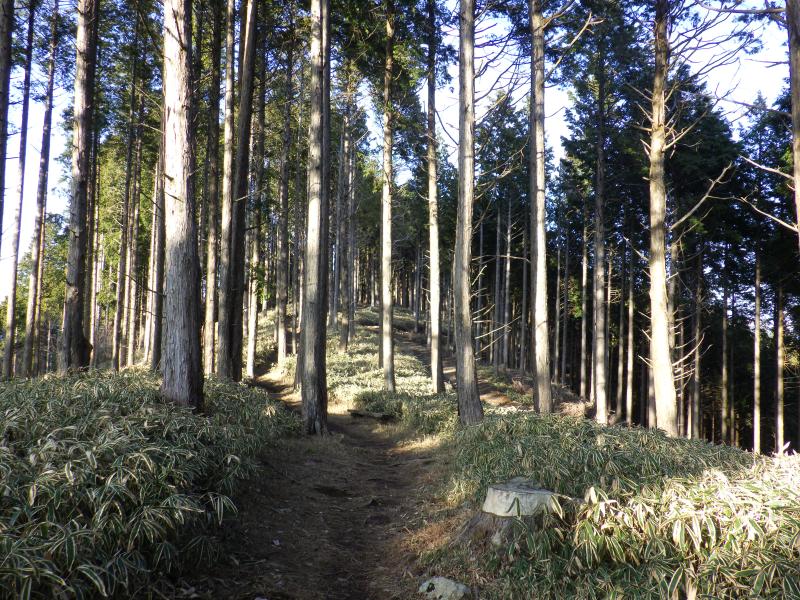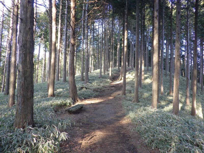 林道が山頂まではわずかの位置である物見岩まで続き、これを利用すればすぐに終わる山ですが、望郷の森から物見岩まで歩いてもたいした距離ではありませんので、今日はここから。以前、来た時は夏前で草が生い茂っていましたが、今回は熊笹だけが目立ちます。