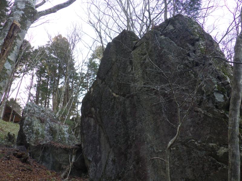 山頂直下には大岩が乱立していますが、ここがヒカリゴケエリアです。下って行ってみますが、苔はあっても季節外ということで光らず。代わりに氷柱が見られました。