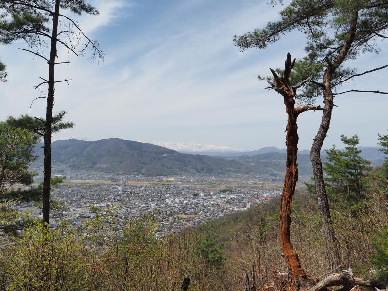 坂城神社奥から登山道へ。ショートカットコースで葛尾城跡へ登りますが、赤松の木々の中を歩く登山道は急登続き。10時スタートと少し遅れての登り始めですでに気温も高くいきなり汗かきました。少し並行移動してからまた急登の始まり。葛尾城跡までの急登よりいくらか緩やかです。結局約1時間で600mくらい登って五里ヶ峯に到着。久しぶりにきつい登りでした。五里ヶ峯からは千曲市の街並みと千曲川と北アルプスがバッチリ。