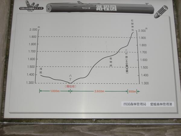 - 石鎚山ロープウェイ(8分)山頂成就駅(20分)成就(25分)八丁(60分)前社森(25分)