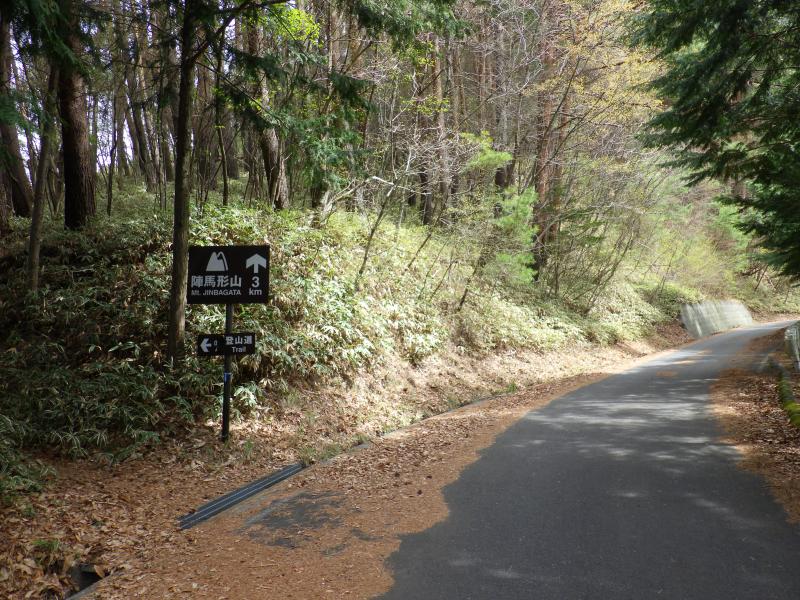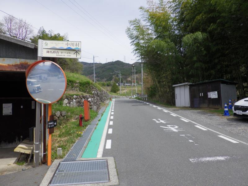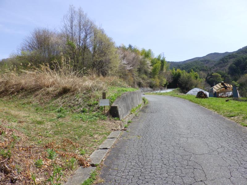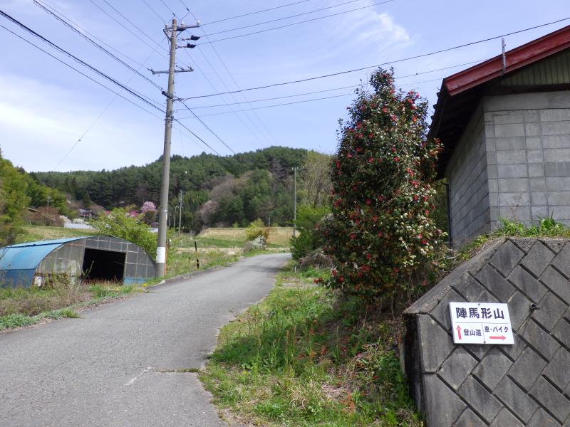 ④竹林を抜け、登って行くと民家の横に出て、再び舗装路、その先で左側から上がってくる道と合流、ここに陣馬形山の標識が出てきます