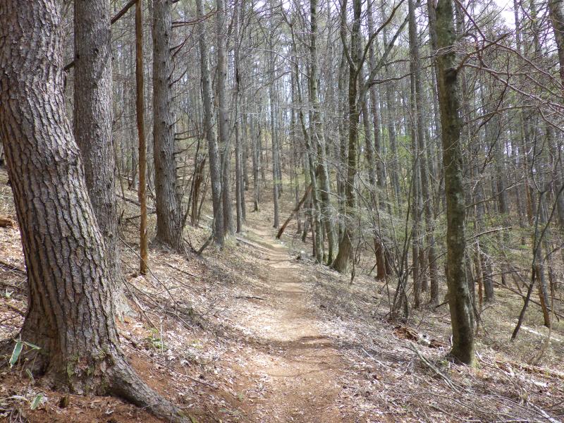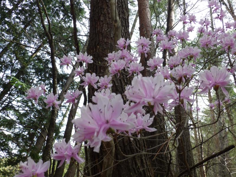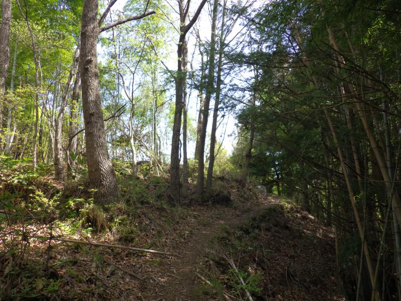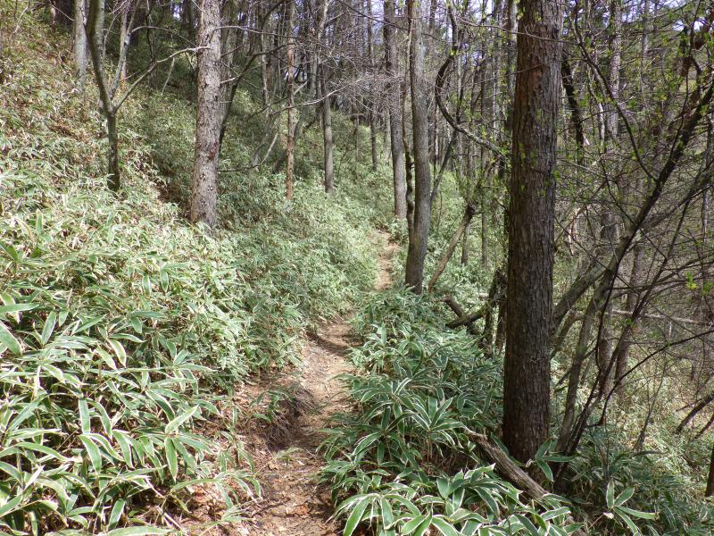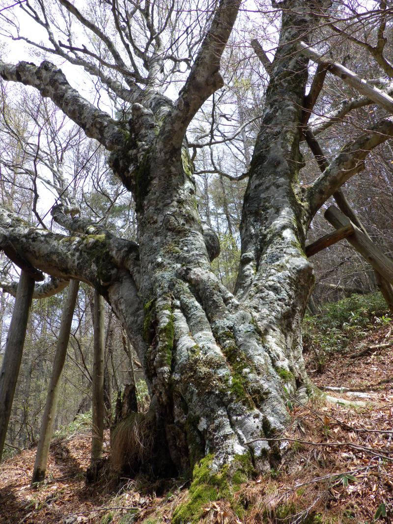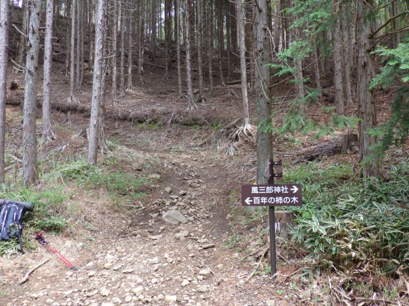 今回はこの美里ルートで登りましたが、出だしの長い舗装路部分があまり標識もなく、これであっているのか疑問を持ちながらの歩行になります。気が付けば登山口手前の百年の柿の木や途中の赤松の大木を見落としてしまいました。登山道は樹林帯の中をグネグネした緩やかな傾斜で、距離を示す標識が何回か出てきますが、概ね、道路の交差で現在地を把握可能です。