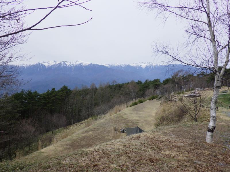 でも長く、なかなか着かない印象です。中継局の建物が見えてきた頃、ようやく山頂部エリアに入ったかなと実感し、上の駐車場までようやくたどり着きました。今日は週末でキャンプ場にはテントを設営している人がちらほら。このアルプスビューラウンジでも充分な展望で、本当にいい場所です。ここから山頂までは散歩程度の距離で、これなら人気なのが分かります。山頂の切り開きは特に中央アルプス側がかなり広く、見渡せ、中央アルプスオールスターズという感じです。また眼下の伊那谷の展望も素晴らしいです。逆の南アルプス側も白峰三山から聖岳まで確認できます。