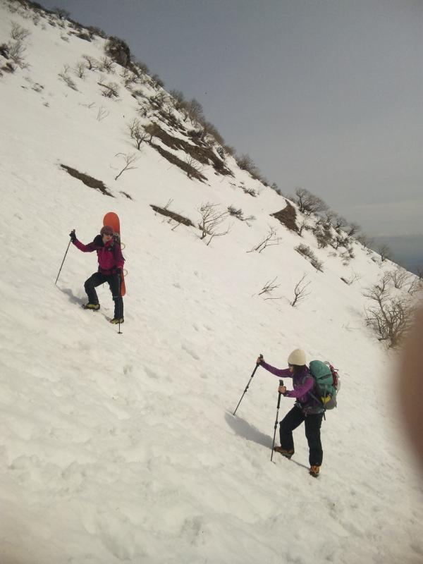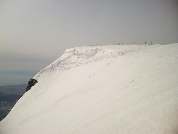 - 雪は溶けて少なくなっています。 山頂直下に雪庇があり、雪崩れた跡もありました。