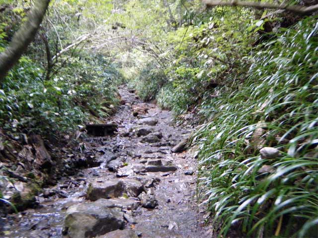 最後の登りは100mほど飛び石が整備されている沢の中を行くので水量やスリップに注意。