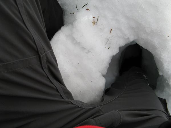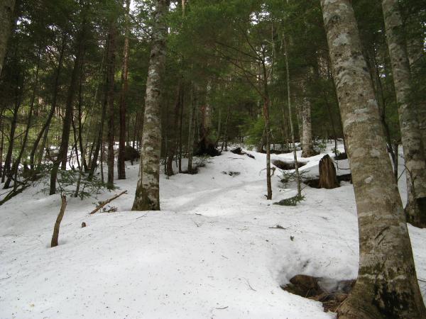 歩き始めてすぐに「これは厳しい」と感じました。前日と当日はかなり気温が高かったせいか雪がゆるんでいて、足が埋まってぜんぜんまともに歩けない…。突然膝上まで埋まって前のめりに転んだり、腰まで埋まってもがいたりと。立ち止まって息を整えてると、突然踏み抜いたようにズボッとその場に埋まることも。