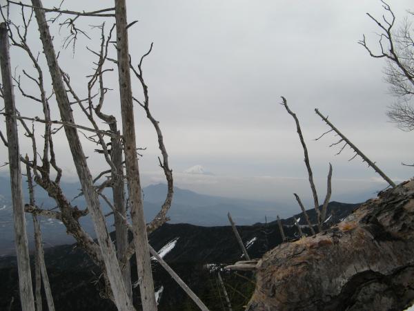 標高が上がれば雪も固くなって歩きやすくなるだろうという希望を抱きつつ登っていたのですが、状況は変わらず。樹林帯が少し開けて富士山が見える地点で休憩。
