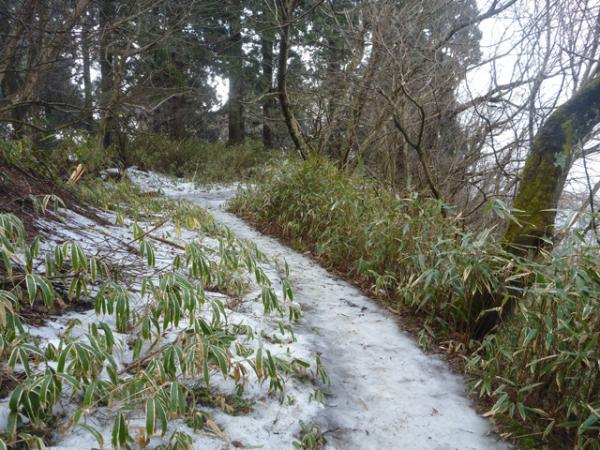 雪は頂上付近だけ少し残っているくらいで、アイゼンはいらないと思います。