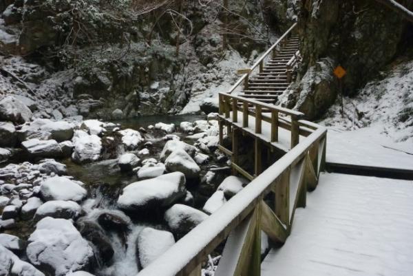 夫婦滝までは渓谷を整備された木道を歩きます。