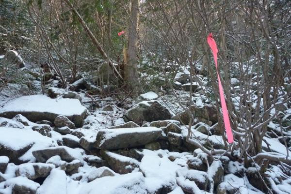 トレースが無かったので木に付いているピンクの目印の布が頼りでした。