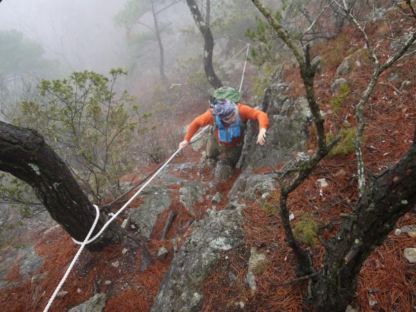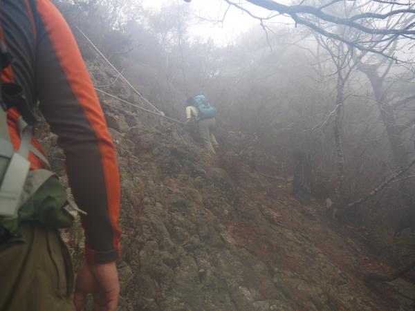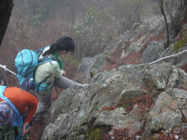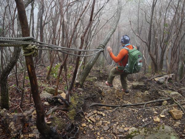 すぐに急登が続き汗が噴き出しますが30分ほどで急登が終わり岩場です。ロープと鎖がありますが、今日は雨で濡れているので一層注意しながら進みます。