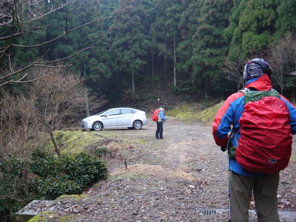 登山口標識まで未舗装の道を車で上がると6~7台分の駐車場があります。